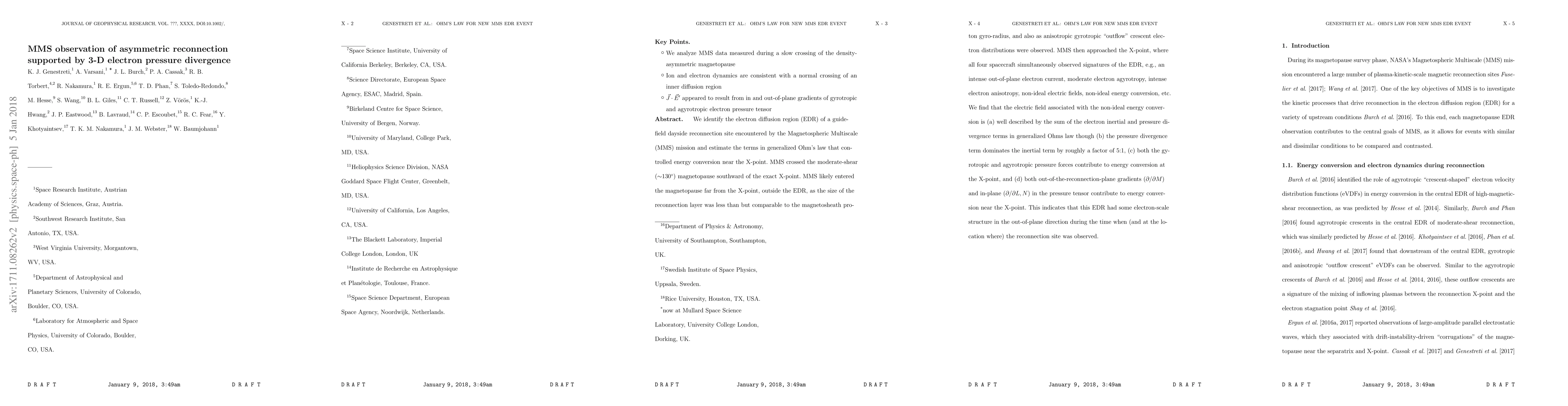 The MMS mission observed an asymmetric electron diffusion region (EDR) at the magnetopause, with significant electron pressure divergence driving energy conversion. The pressure divergence term dominated the inertial term by a factor of 5:1, indicating electron-scale structure in the out-of-plane direction.