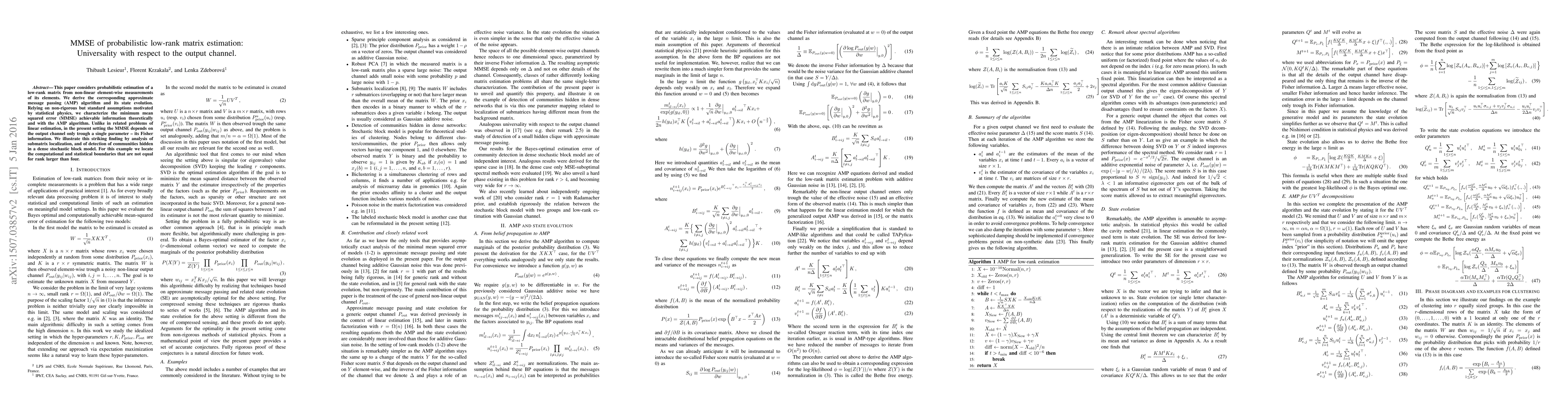 This paper presents an AMP algorithm for probabilistic low-rank matrix estimation, showing that the minimum mean squared error (MMSE) depends solely on the Fisher information of the output channel. The findings are illustrated through submatrix localization and community detection in stochastic block models, revealing distinct computational and statistical limits for ranks greater than four.