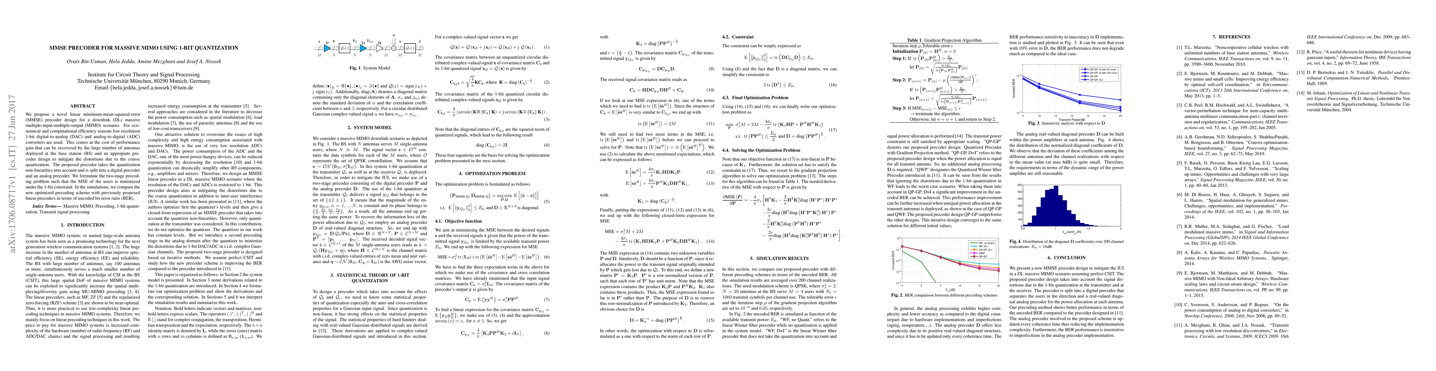 We propose a novel linear minimum-mean-squared-error (MMSE) precoder design for a downlink (DL) massive multiple-input-multiple-output (MIMO) scenario. For economical and computational efficiency reasons low resolution 1-bit digital-to-analog (DAC) and analog-to-digital (ADC) converters are used. This comes at the cost of performance gain that can be recovered by the large number of antennas deployed at the base station (BS) and an appropiate precoder design to mitigate the distortions due to the coarse quantization. The proposed precoder takes the quantization non-linearities into account and is split into a digital precoder and an analog precoder. We formulate the two-stage precoding problem such that the MSE of the users is minimized under the 1-bit constraint. In the simulations, we compare the new optimized precoding scheme with previously proposed linear precoders in terms of uncoded bit error ratio (BER).