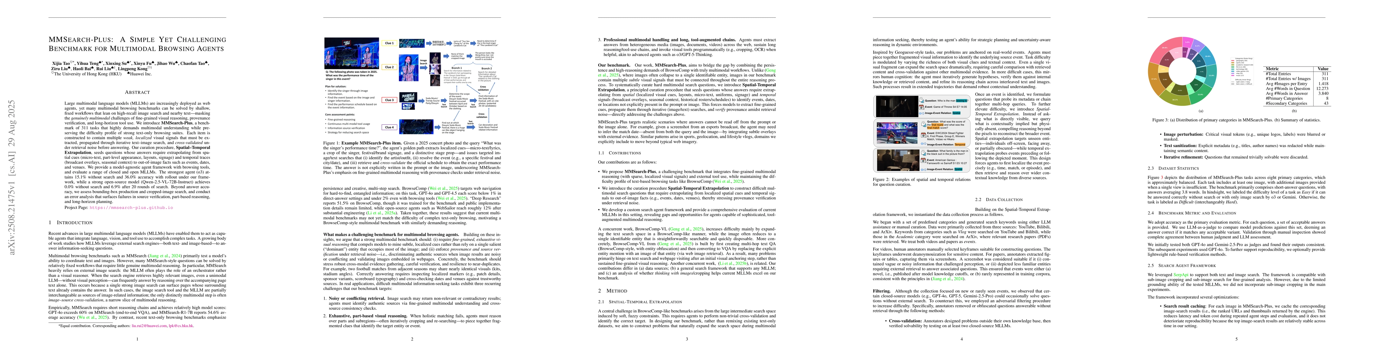 Large multimodal language models (MLLMs) are increasingly deployed as web agents, yet many multimodal browsing benchmarks can be solved by shallow, fixed workflows that lean on high-recall image search and nearby text-masking the genuinely multimodal challenges of fine-grained visual reasoning, provenance verification, and long-horizon tool use. We introduce MMSearch-Plus, a benchmark of 311 tasks that highly demand multimodal understanding while preserving the difficulty profile of strong text-only browsing suites. Each item is constructed to contain multiple weak, localized visual signals that must be extracted, propagated through iterative text-image search, and cross-validated under retrieval noise before answering. Our curation procedure, Spatial-Temporal Extrapolation, seeds questions whose answers require extrapolating from spatial cues (micro-text, part-level appearance, layouts, signage) and temporal traces (broadcast overlays, seasonal context) to out-of-image facts such as events, dates, and venues. We provide a model-agnostic agent framework with browsing tools and evaluate a range of closed and open MLLMs. The strongest agent (o3) attains 15.1% without search and 36.0% accuracy with rollout under our framework, while a strong open-source model (Qwen-2.5-VL-72B-Instruct) achieves 0.0% without search and 6.9% after 20 rounds of search. Beyond answer accuracy, we assess bounding-box production and cropped-image search, and conduct an error analysis that surfaces failures in source verification, part-based reasoning, and long-horizon planning.