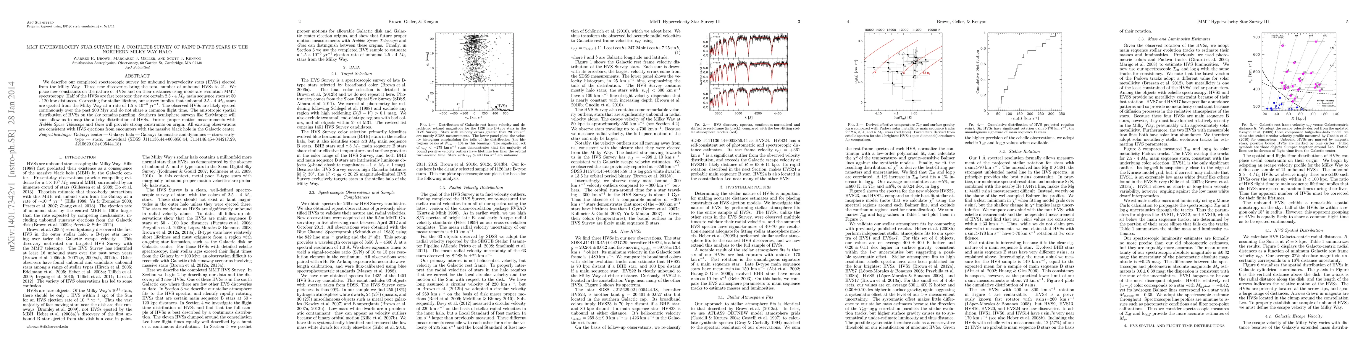 We describe our completed spectroscopic survey for unbound hypervelocity stars (HVSs) ejected from the Milky Way. Three new discoveries bring the total number of unbound HVSs to 21. We place new constraints on the nature of HVSs and on their distances using moderate resolution MMT spectroscopy. Half of the HVSs are fast rotators; they are certain 2.5-4 Msun main sequence stars at 50 - 120 kpc distances. Correcting for stellar lifetime, our survey implies that unbound 2.5-4 Msun stars are ejected from the Milky Way at a rate of 1.5e-6 /yr. The observed HVSs are likely ejected continuously over the past 200 Myr and do not share a common flight time. The anisotropic spatial distribution of HVSs on the sky remains puzzling. Southern hemisphere surveys like SkyMapper will soon allow us to map the all-sky distribution of HVSs. Future proper motion measurements with Hubble Space Telescope and Gaia will provide strong constraints on origin. All existing observations are consistent with HVS ejections from encounters with the massive black hole in the Galactic center.