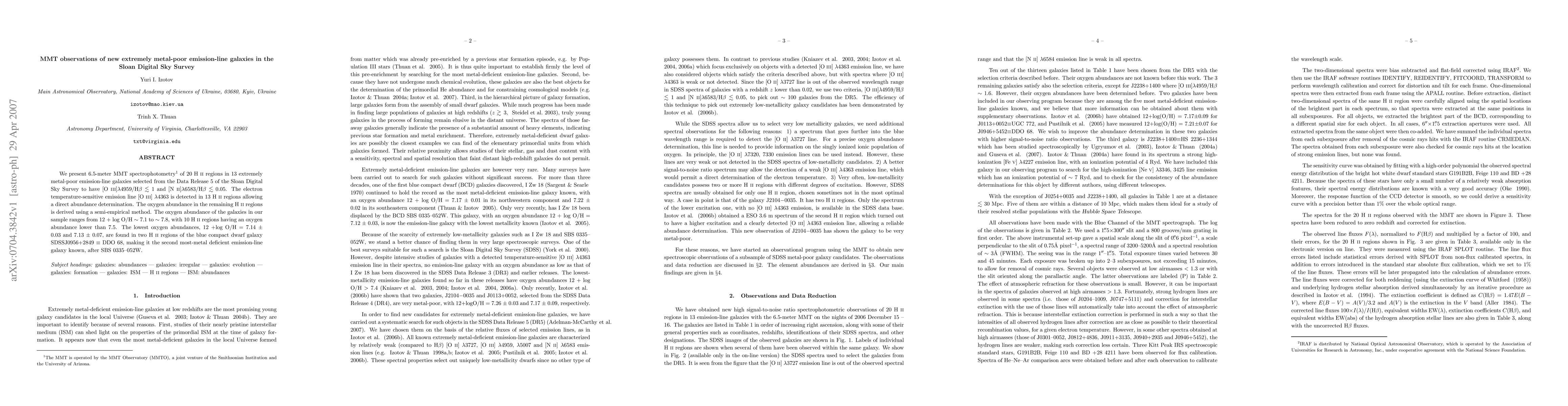 This paper reports on 6.5-meter MMT spectrophotometry of 20 H II regions in 13 extremely metal-poor emission-line galaxies from the Sloan Digital Sky Survey, revealing oxygen abundances ranging from 7.1 to 7.8. The galaxy SDSSJ0956+2849=DDO 68, with two H II regions, has the lowest oxygen abundances, making it the second most metal-deficient emission-line galaxy known.