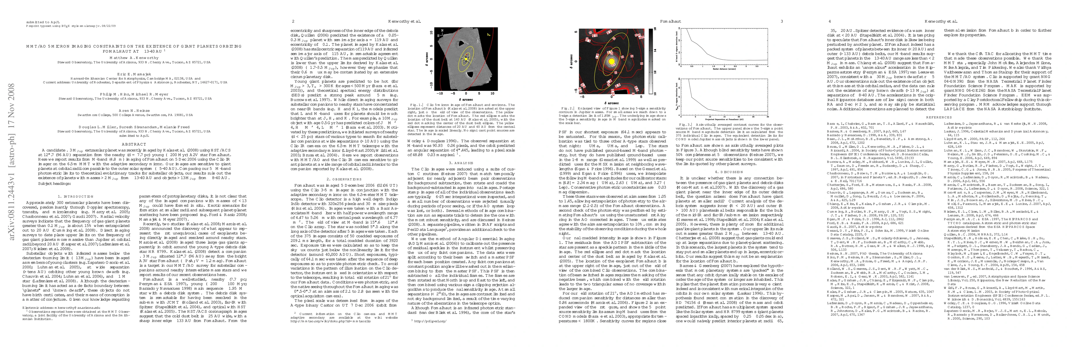 A candidate < 3 Jupiter mass, extrasolar planet was recently imaged by Kalas et al. (2008) using HST/ACS at 12.7" (96 AU) separation from the nearby (d = 7.7 pc) young (~200 Myr) A2V star Fomalhaut. Here we report results from M-band (4.8 micron) imaging of Fomalhaut on 5 Dec 2006 using the Clio IR imager on the 6.5-m MMT with the adaptive secondary mirror. Our images are sensitive to giant planets at orbital radii comparable to the outer solar system (~5-40 AU). Comparing our 5-sigma M-band photometric limits to theoretical evolutionary tracks for substellar objects, our results rule out the existence of planets with masses greater than 2 Jupiter masses, from ~13-40 AU and objects greater than 13 Jupiter masses from ~8-40 AU.