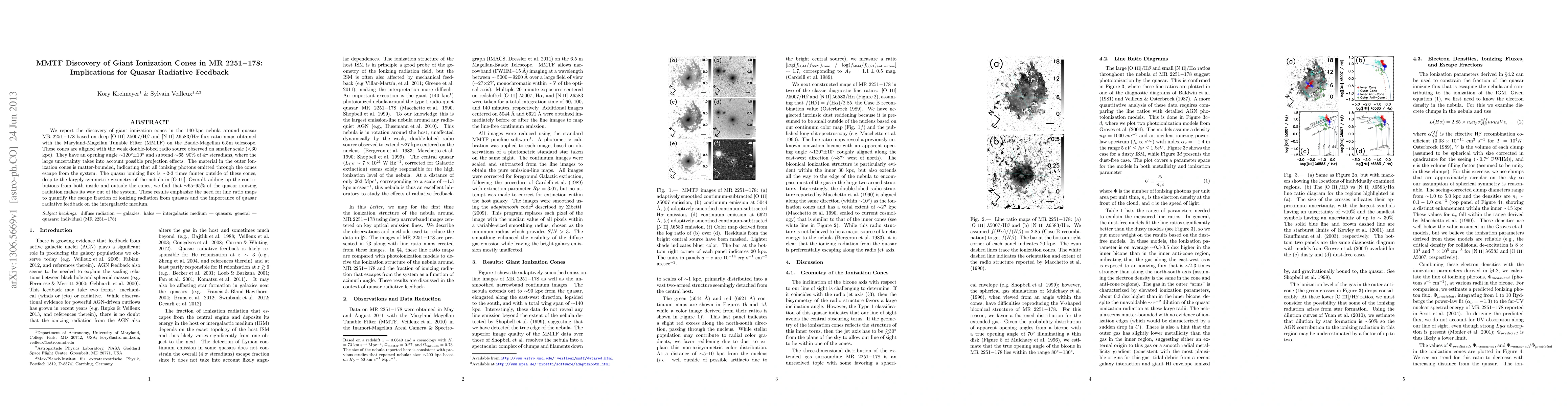 The research discovers giant ionization cones around quasar MR 2251-178 using Maryland-Magellan Tunable Filter (MMTF) observations. These cones, aligned with a weak radio source, suggest that 65-95% of quasar ionizing radiation escapes, highlighting the significance of line ratio maps in understanding quasar radiative feedback on the intergalactic medium.