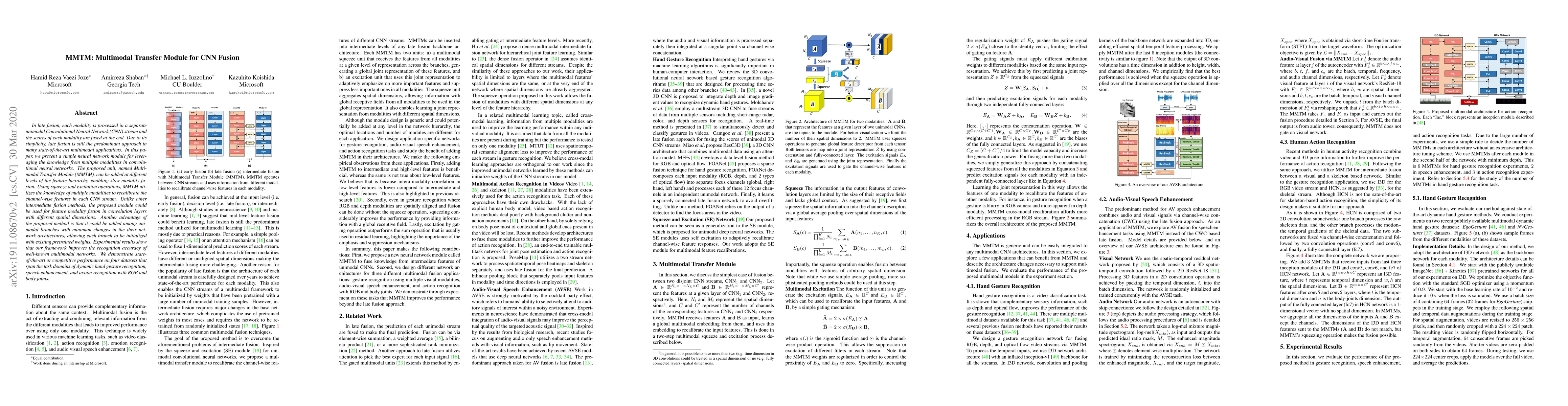 The paper introduces the Multimodal Transfer Module (MMTM) to enhance convolutional neural networks by integrating knowledge from multiple modalities. MMTM enables gradual fusion of modalities through channel-wise feature recalibration, achieving state-of-the-art performance on various multimodal tasks.