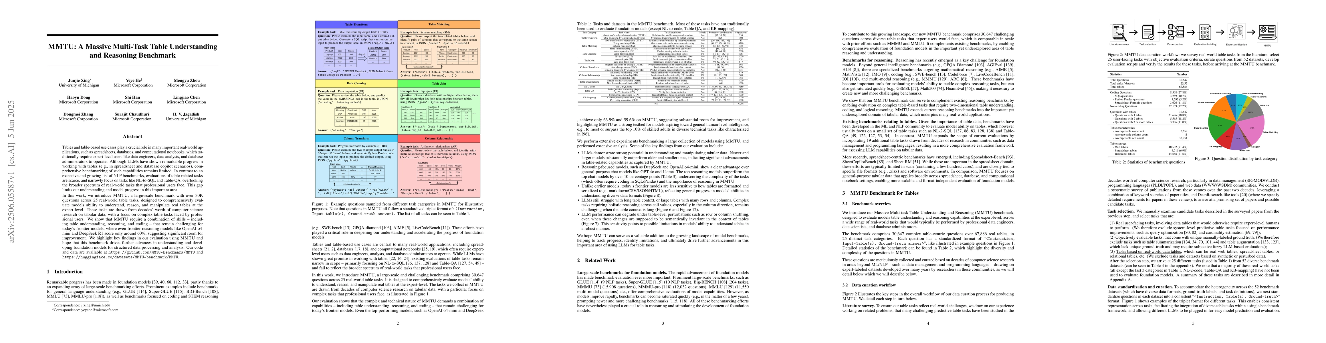 A new benchmark, MMTU, evaluates models' ability to understand, reason, and manipulate real tables at an expert level, highlighting a need for improvement in current models, which score around 60%.
