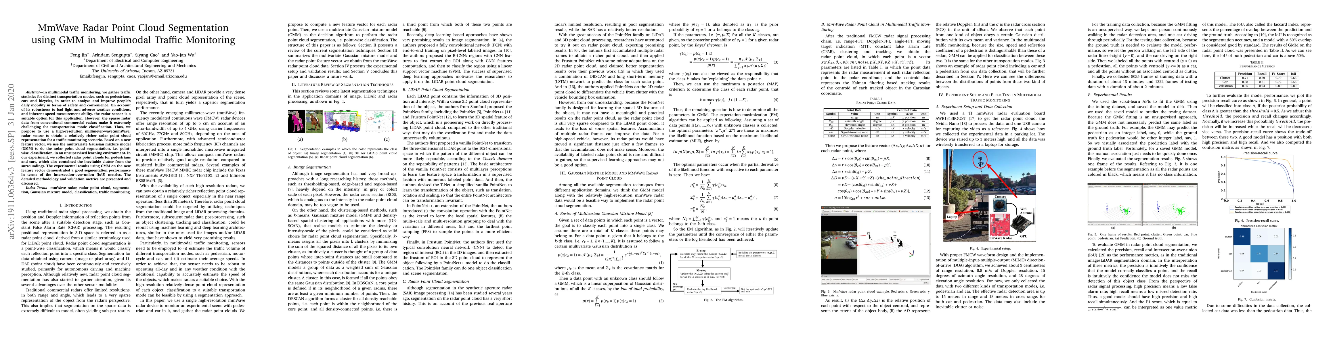 This paper proposes using high-resolution mmWave radar and a multivariate Gaussian mixture model (GMM) for segmenting and classifying radar point clouds in multimodal traffic monitoring. The GMM-based segmentation achieved good performance in distinguishing between pedestrians and cars, as validated by intersection-over-union metrics.
