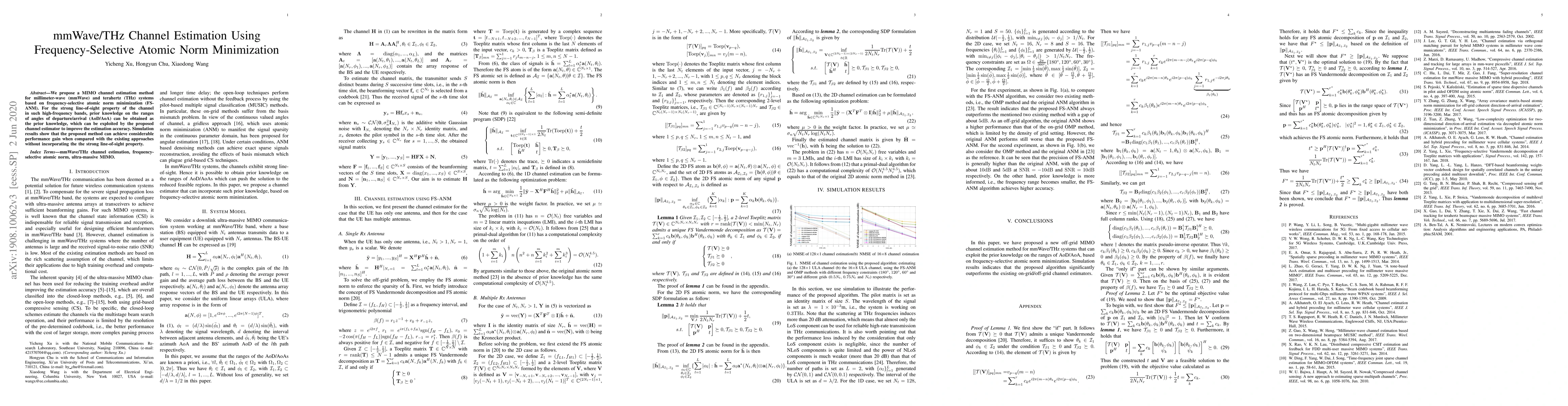 This paper proposes a MIMO channel estimation method for mmWave and THz systems using frequency-selective atomic norm minimization (FS-ANM). The method leverages prior knowledge of angles of departure/arrival to enhance estimation accuracy, demonstrating significant performance improvements over existing approaches.