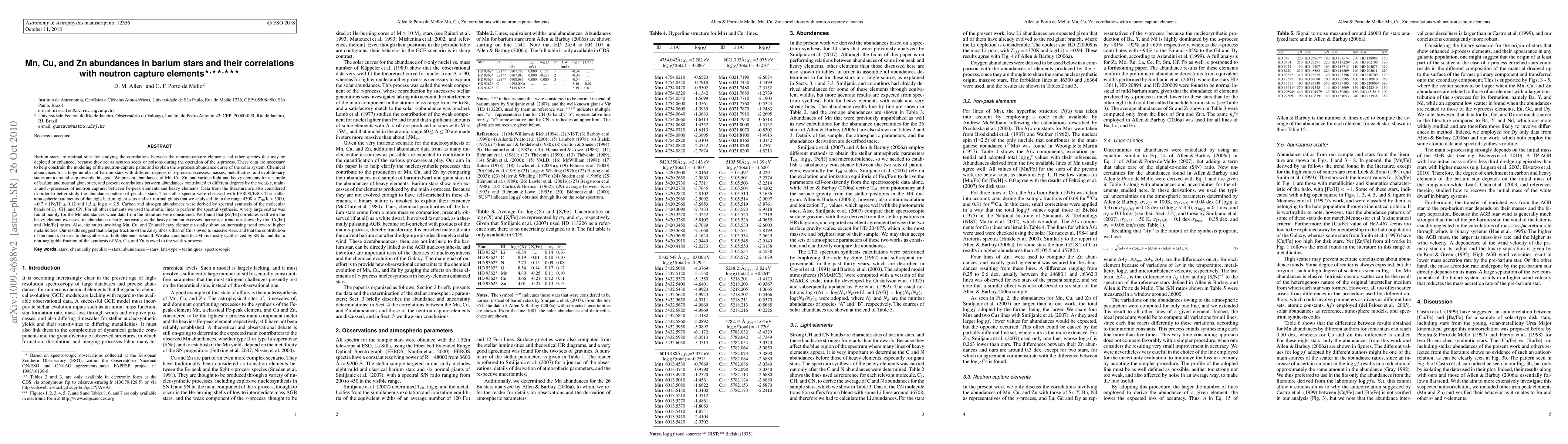 This paper investigates the abundances of Mn, Cu, and Zn in barium stars compared to normal giant stars, finding correlations with neutron capture elements. The study reveals that Zn abundance correlates well with heavy element excesses, suggesting a larger synthesis contribution from massive stars compared to Cu, while Mn is primarily synthesized by SN Ia with a significant weak s-process contribution.