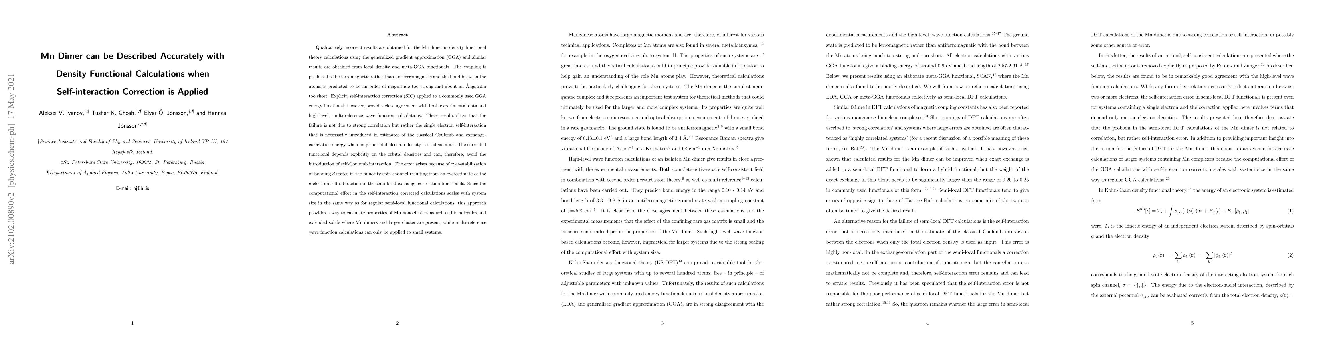 This paper demonstrates that density functional theory (DFT) calculations using generalized gradient approximation (GGA) fail to accurately describe the Mn dimer, predicting ferromagnetic coupling and overly strong bonding. Applying self-interaction correction (SIC) to GGA resolves these issues, aligning results with experimental data and high-level wave function calculations, highlighting the importance of correcting self-interaction errors in semi-local DFT.