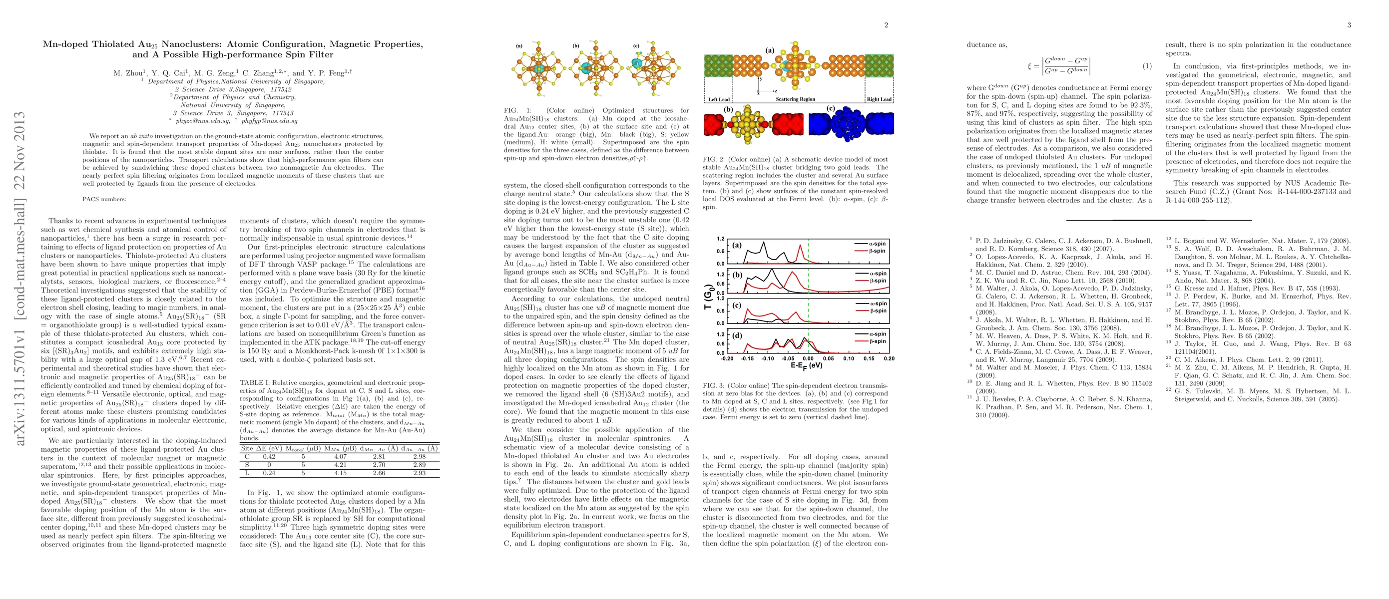 We report an \emph{ab inito} investigation on the ground-state atomic configuration, electronic structures, magnetic and spin-dependent transport properties of Mn-doped Au$_{25}$ nanoclusters protected by thiolate. It is found that the most stable dopant sites are near surfaces, rather than the center positions of the nanoparticles. Transport calculations show that high-performance spin filters can be achieved by sandwiching these doped clusters between two nonmagnetic Au electrodes. The nearly perfect spin filtering originates from localized magnetic moments of these clusters that are well protected by ligands from the presence of electrodes.