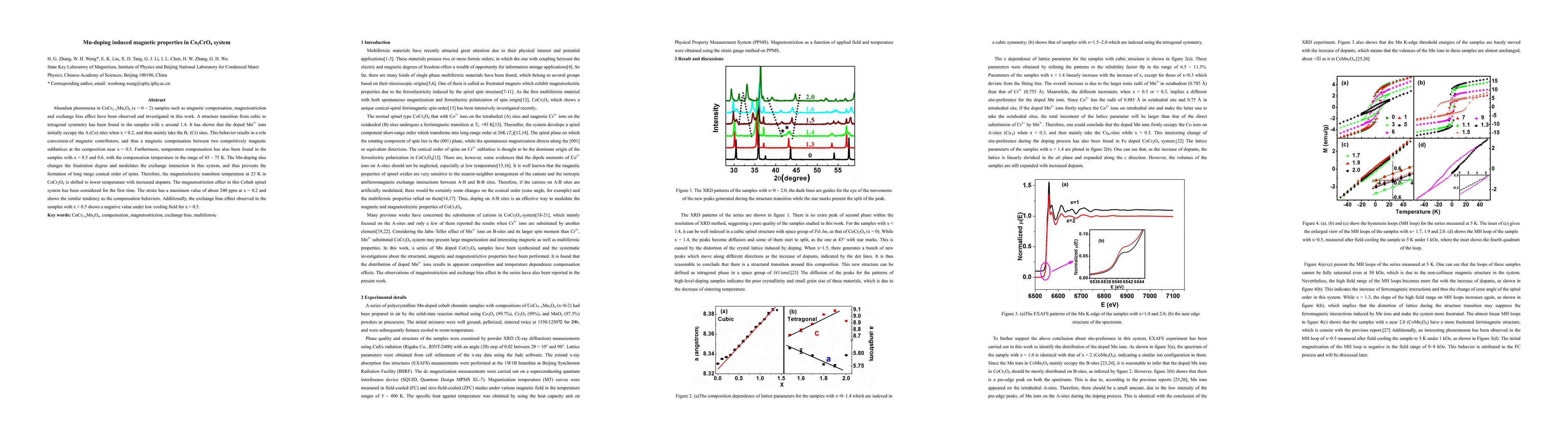 Abundant phenomena in CoCr2-xMnxO4 (x = 0 ~ 2) samples such as magnetic compensation, magnetostriction and exchange bias effect have been observed and investigated in this work. A structure transition from cubic to tetragonal symmetry has been found in the samples with x around 1.4. It has shown that the doped Mn3+ ions initially occupy the A (Co) sites when x < 0.2, and then mainly take the B1 (Cr) sites. This behavior results in a role conversion of magnetic contributors, and thus a magnetic compensation between two competitively magnetic sublattices at the composition near x = 0.5. Furthermore, temperature compensation has also been found in the samples with x = 0.5 and 0.6, with the compensation temperature in the range of 45 ~ 75 K. The Mn-doping also changes the frustration degree and modulates the exchange interaction in this system, and thus prevents the formation of long range conical order of spins. Therefore, the magnetoelectric transition temperature at 23 K in CoCr2O4 is shifted to lower temperature with increased dopants. The magnetostriction effect in this Cobalt spinel system has been considered for the first time. The strain has a maximum value of about 240 ppm at x = 0.2 and shows the similar tendency as the compensation behaviors. Additionally, the exchange bias effect observed in the samples with x < 0.5 shows a negative value under low cooling field for x = 0.5.