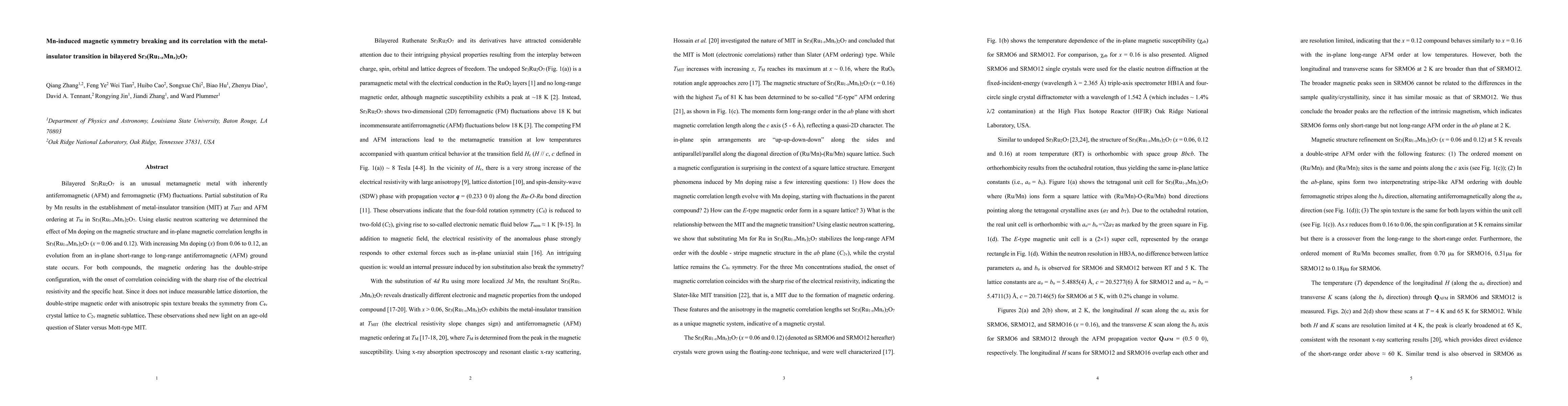 This study investigates the magnetic symmetry breaking and metal-insulator transition in Mn-doped Sr3(Ru1-xMnx)2O7, revealing that Mn doping induces a transition from short-range to long-range double-stripe antiferromagnetic order, correlating with the transition and breaking the crystal lattice symmetry from C4v to C2v. This magnetic order is linked to the electrical resistivity and specific heat changes, providing insights into the nature of the metal-insulator transition.