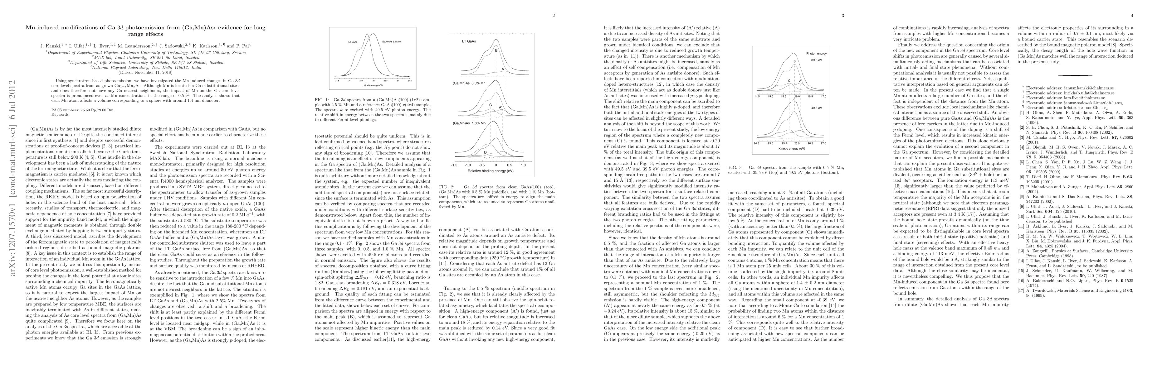 This study reveals significant Mn-induced modifications in Ga 3d core level spectra from (Ga, Mn)As, demonstrating pronounced long-range effects despite Mn atoms not being nearest neighbors to Ga. Each Mn atom influences a volume of approximately 1.4 nm in diameter.