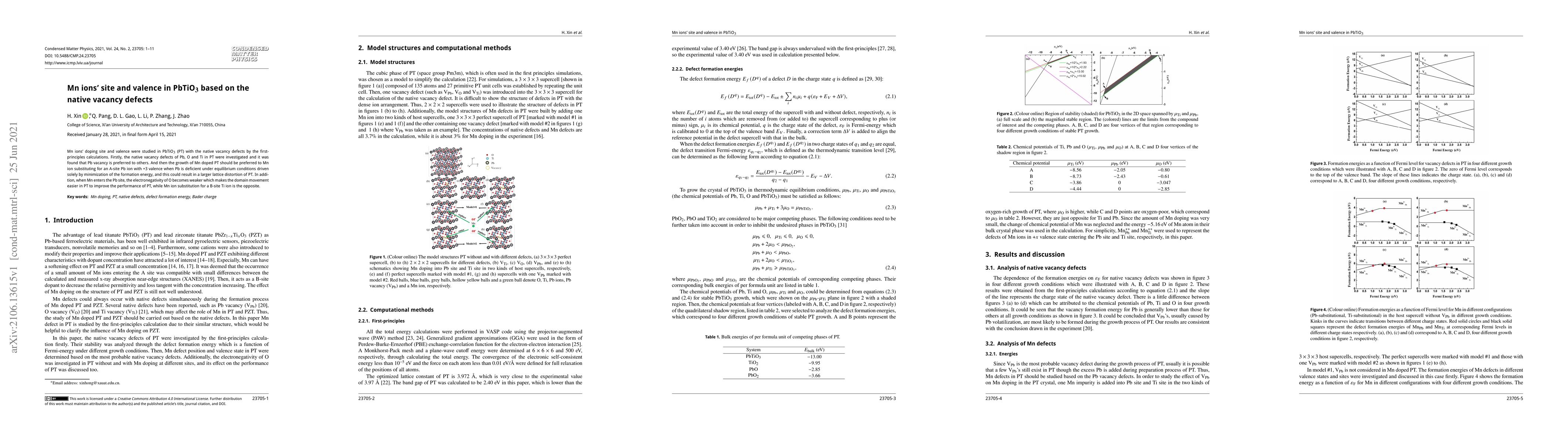 Mn ions' doping site and valence were studied in PbTiO$_{3}$ (PT) with the native vacancy defects by the first-principles calculations. Firstly, the native vacancy defects of Pb, O and Ti in PT were investigated and it was found that Pb vacancy is preferred to others. And then the growth of Mn doped PT should be preferred to Mn ion substituting for an A-site Pb ion with +3 valence when Pb is deficient under equilibrium conditions driven solely by minimization of the formation energy, and this could result in a larger lattice distortion of PT. In addition, when Mn enters the Pb site, the electronegativity of O becomes weaker which makes the domain movement easier in PT to improve the performance of PT, while Mn ion substitution for a B-site Ti ion is the opposite.
