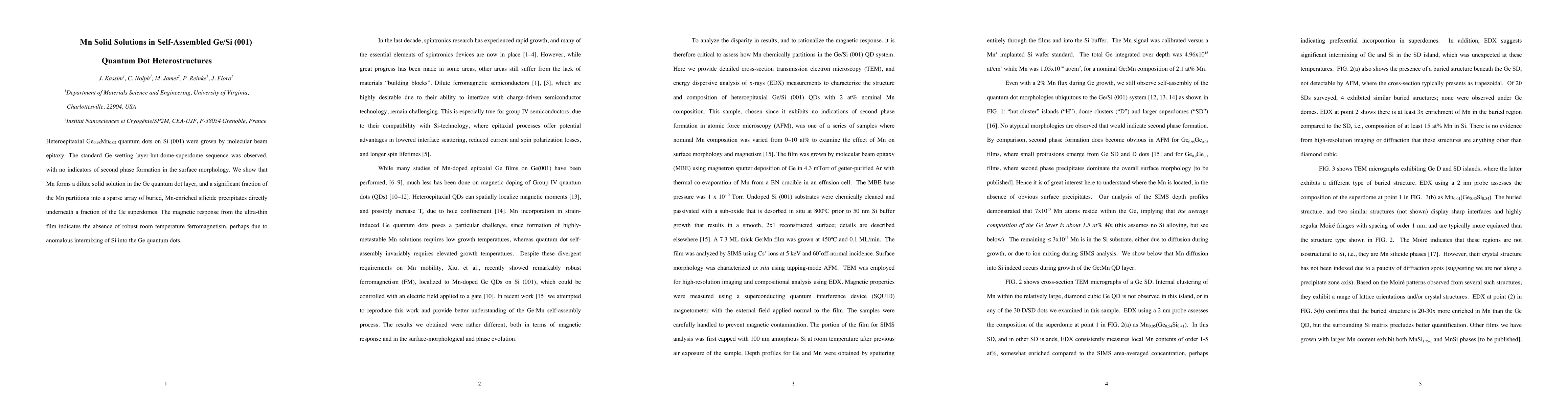 This research investigates Mn solid solutions in Ge/Si quantum dot heterostructures grown via molecular beam epitaxy, revealing that Mn forms both in the Ge quantum dots and as buried silicide precipitates. Despite the presence of Mn, the study finds no robust room temperature ferromagnetism, likely due to Si intermixing.
