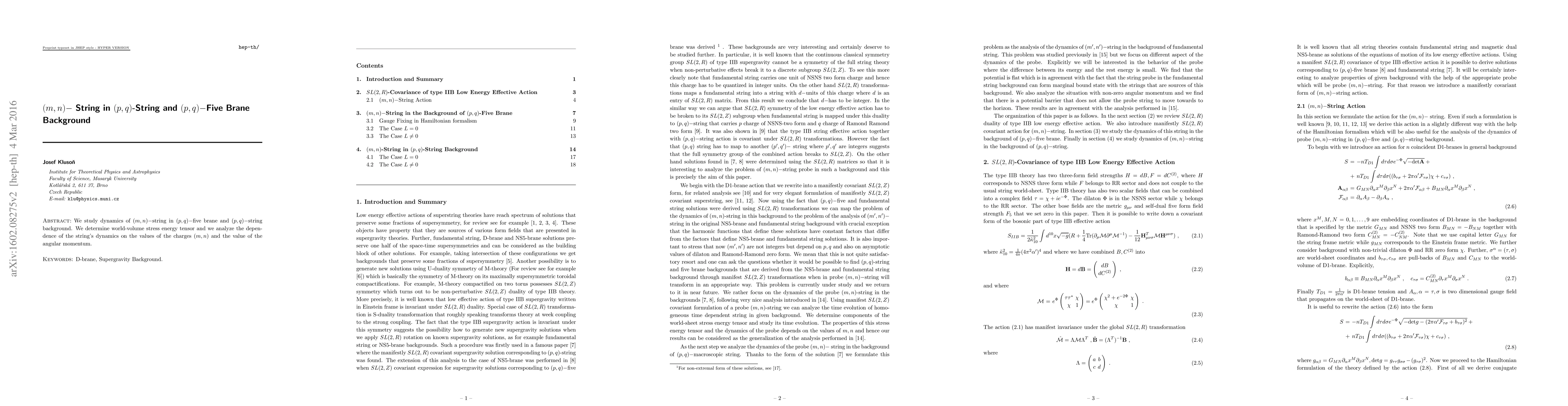 We study dynamics of (m,n)-string in (p,q)-five brane and (p,q)-string background. We determine world-volume stress energy tensor and we analyze the dependence of the string's dynamics on the values of the charges (m,n) and the value of the angular momentum.
