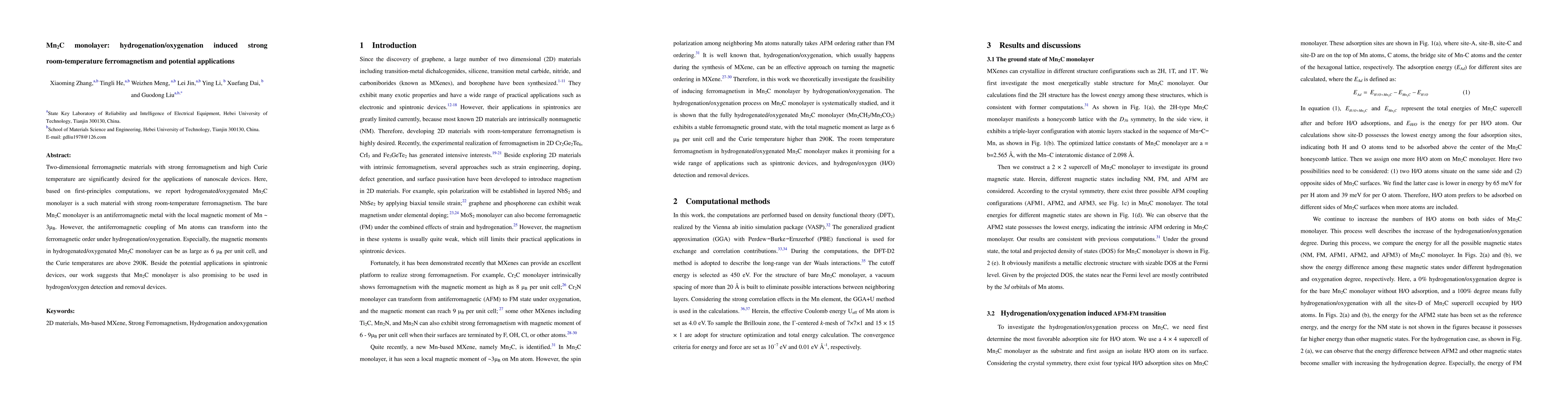 This research reveals that hydrogenated/oxygenated Mn2C monolayer exhibits strong room-temperature ferromagnetism with high Curie temperatures, making it a promising material for spintronic devices and applications in hydrogen/oxygen detection and removal. The transformation from antiferromagnetic to ferromagnetic order is achieved through hydrogenation/oxygenation.