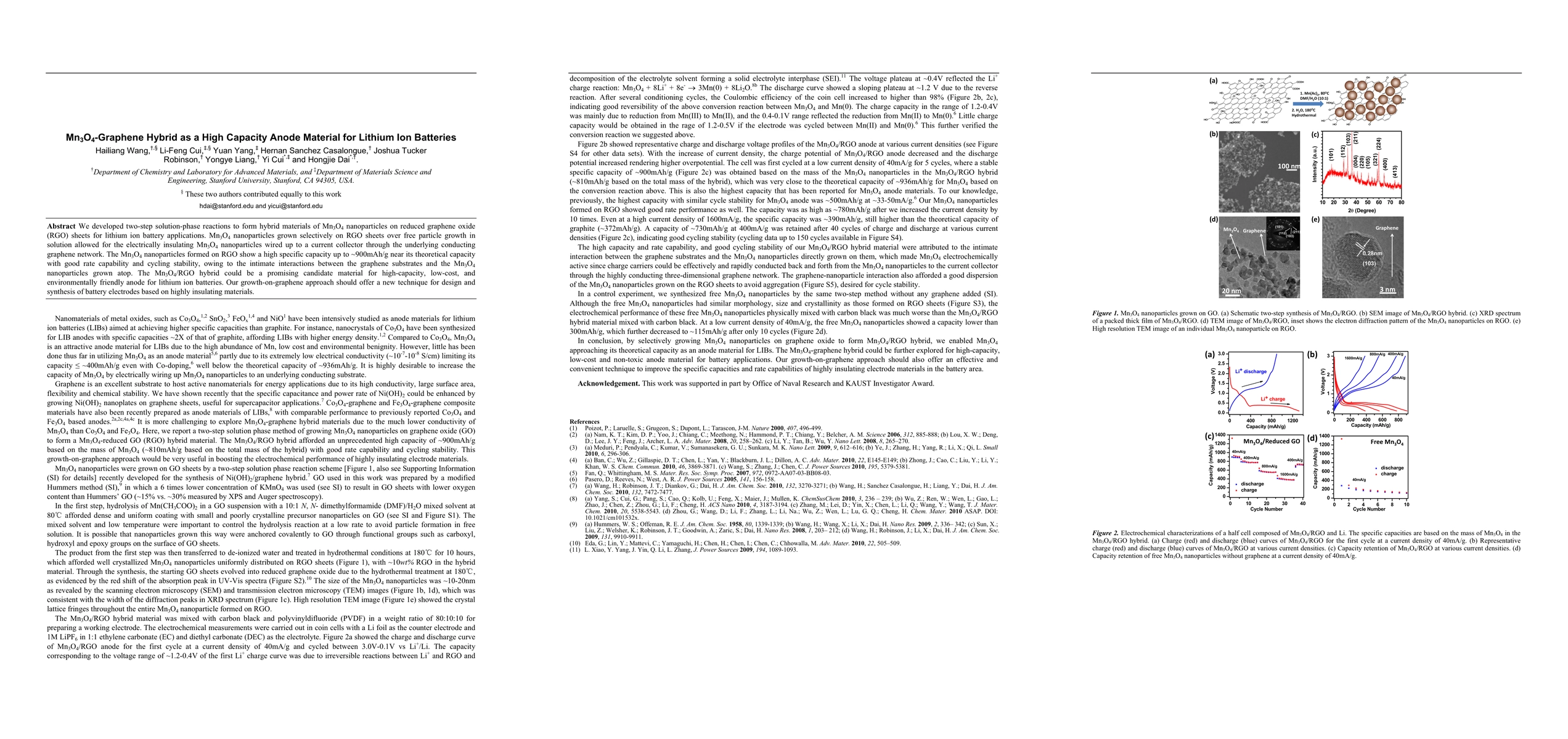 This paper describes the synthesis of Mn3O4 nanoparticles on reduced graphene oxide sheets via a two-step solution process, creating a hybrid material with high capacity for lithium ion batteries. The Mn3O4/RGO hybrid demonstrates excellent specific capacity, rate capability, and cycling stability due to the conductive graphene network.