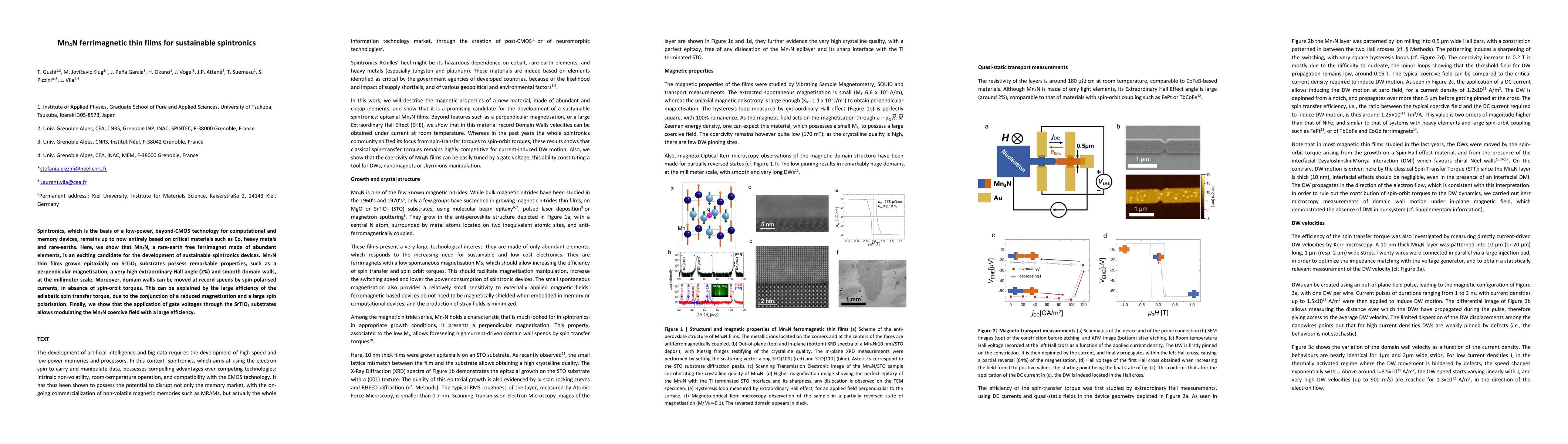 This paper presents Mn4N ferrimagnetic thin films as a sustainable spintronics alternative, free from rare-earth materials, demonstrating high efficiency in spin transfer torque and gate voltage modulation of coercive field. The epitaxially grown films on SrTiO3 substrates exhibit perpendicular magnetization and high extraordinary Hall angle.