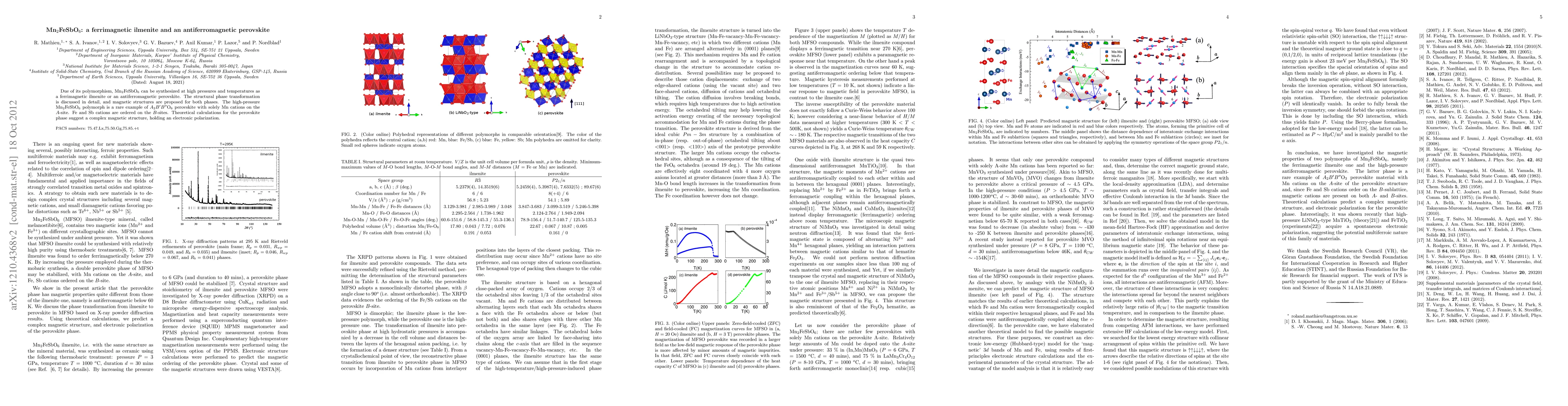 Mn$_2$FeSbO$_6$ exhibits polymorphism, forming either a ferrimagnetic ilmenite or an antiferromagnetic perovskite phase under high pressure and temperature. The study details the structural phase transformation and proposes magnetic structures for both phases, highlighting the perovskite's unique electronic polarization.