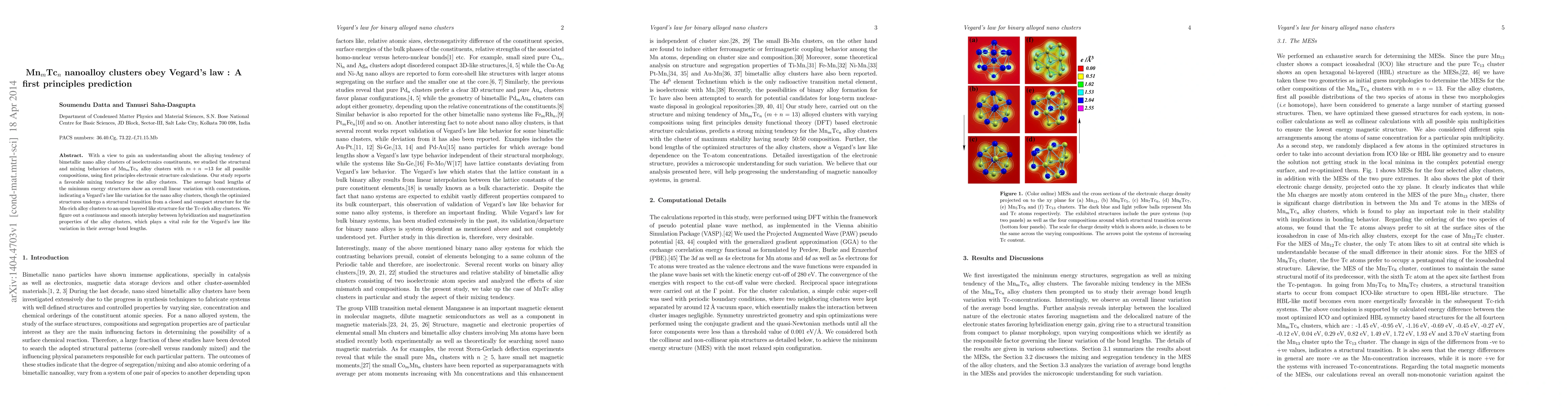 With a view to gain an understanding about the alloying tendency of bimetallic nano alloy clusters of isoelectronics constituents, we studied the structural and mixing behaviors of Mn$_m$Tc$_n$ alloy clusters with $m+n =$13 for all possible compositions, using first principles electronic structure calculations. Our study reports a favorable mixing tendency for the alloy clusters. The average bond lengths of the minimum energy structures show an overall linear variation with concentrations, indicating a Vegard's law like variation for the nano alloy clusters, though the optimized structures undergo a structural transition from a closed and compact structure for the Mn-rich alloy clusters to an open layered like structure for the Tc-rich alloy clusters. We figure out a continuous and smooth interplay between hybridization and magnetization properties of the alloy clusters, which plays a vital role for the Vegard's law like variation in their average bond lengths.