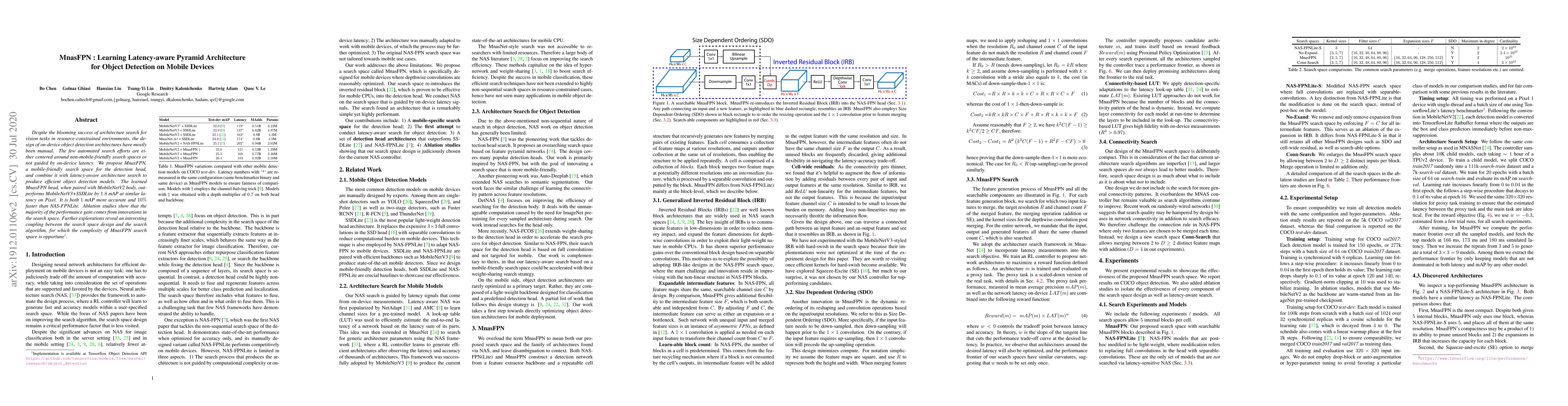 MnasFPN combines latency-aware architecture search with a mobile-friendly detection head to create efficient object detection models for mobile devices, outperforming existing methods in accuracy and speed. The design of the search space is identified as the primary contributor to its superior performance.