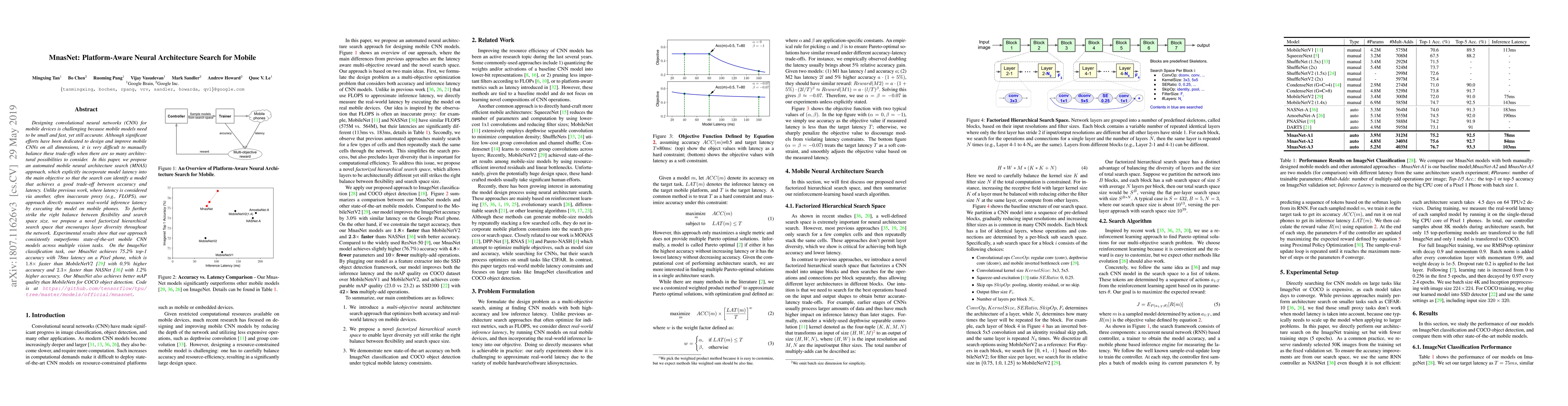 Designing convolutional neural networks (CNN) for mobile devices is challenging because mobile models need to be small and fast, yet still accurate. Although significant efforts have been dedicated to design and improve mobile CNNs on all dimensions, it is very difficult to manually balance these trade-offs when there are so many architectural possibilities to consider. In this paper, we propose an automated mobile neural architecture search (MNAS) approach, which explicitly incorporate model latency into the main objective so that the search can identify a model that achieves a good trade-off between accuracy and latency. Unlike previous work, where latency is considered via another, often inaccurate proxy (e.g., FLOPS), our approach directly measures real-world inference latency by executing the model on mobile phones. To further strike the right balance between flexibility and search space size, we propose a novel factorized hierarchical search space that encourages layer diversity throughout the network. Experimental results show that our approach consistently outperforms state-of-the-art mobile CNN models across multiple vision tasks. On the ImageNet classification task, our MnasNet achieves 75.2% top-1 accuracy with 78ms latency on a Pixel phone, which is 1.8x faster than MobileNetV2 [29] with 0.5% higher accuracy and 2.3x faster than NASNet [36] with 1.2% higher accuracy. Our MnasNet also achieves better mAP quality than MobileNets for COCO object detection. Code is at https://github.com/tensorflow/tpu/tree/master/models/official/mnasnet