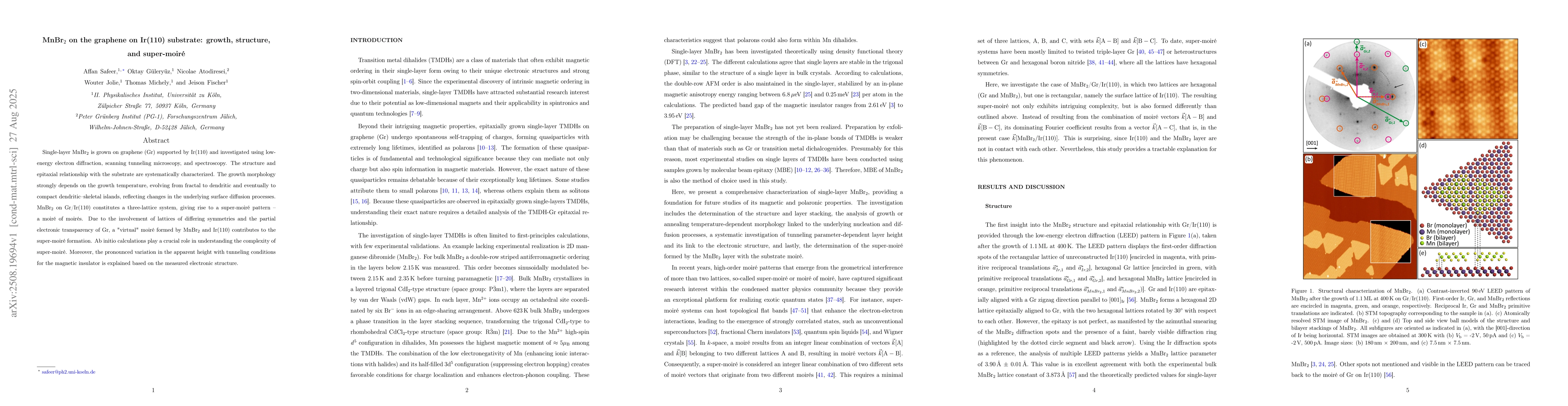 Single-layer MnBr$_2$ is grown on graphene (Gr) supported by Ir(110) and investigated using low-energy electron diffraction, scanning tunneling microscopy, and spectroscopy. The structure and epitaxial relationship with the substrate are systematically characterized. The growth morphology strongly depends on the growth temperature, evolving from fractal to dendritic and eventually to compact dendritic skeletal islands, reflecting changes in the underlying surface diffusion processes. MnBr$_2$ on Gr/Ir(110) constitutes a three-lattice system, giving rise to a super-moir\'e pattern --a moir\'e of moir\'es. Due to the involvement of lattices of differing symmetries and the partial electronic transparency of Gr, a "virtual" moir\'e formed by MnBr$_2$ and Ir(110) contributes to the super-moir\'e formation. Ab initio calculations play a crucial role in understanding the complexity of super-moir\'e. Moreover, the pronounced variation in the apparent height with tunneling conditions for the magnetic insulator is explained based on the measured electronic structure.