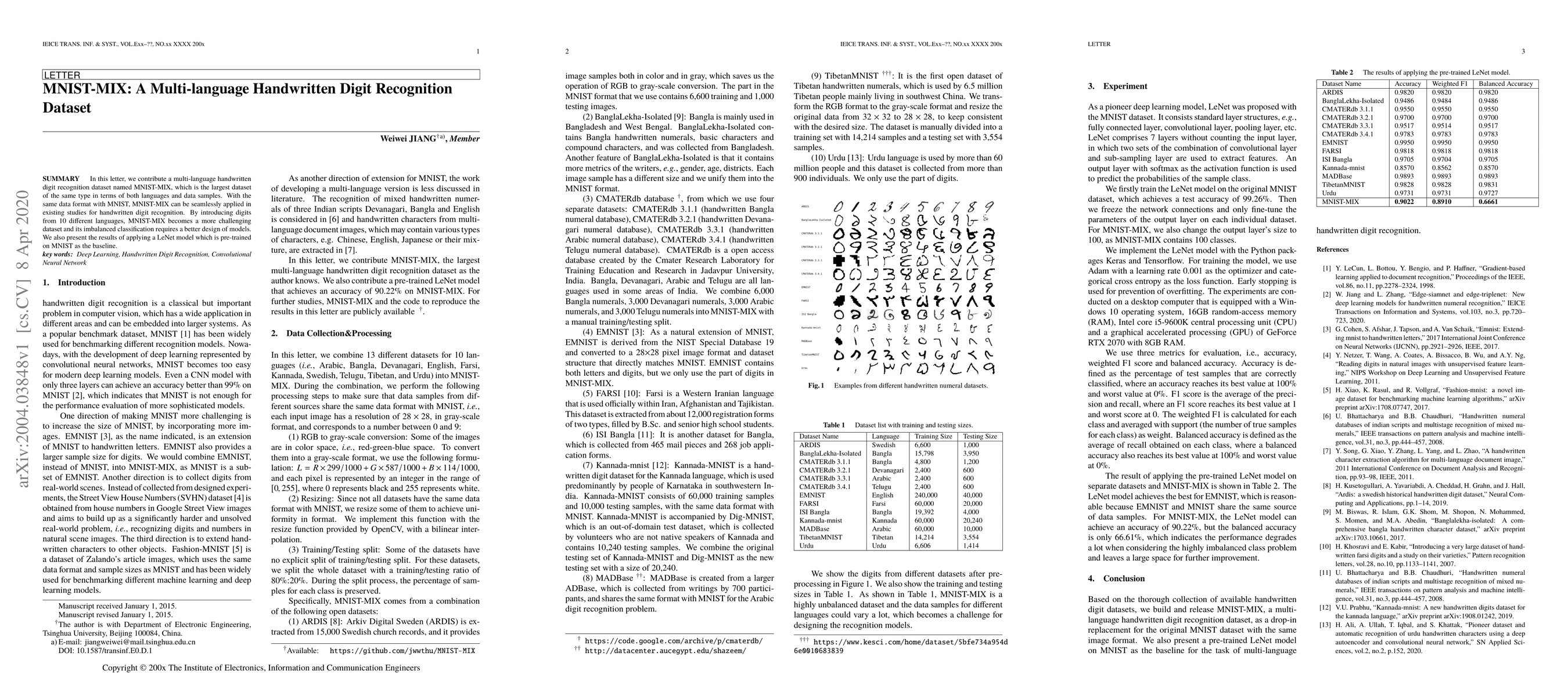 The MNIST-MIX dataset introduces handwritten digits from 10 different languages, expanding the scope of multi-language recognition studies. A pre-trained LeNet model on MNIST serves as a baseline for performance evaluation on this more challenging and imbalanced dataset.