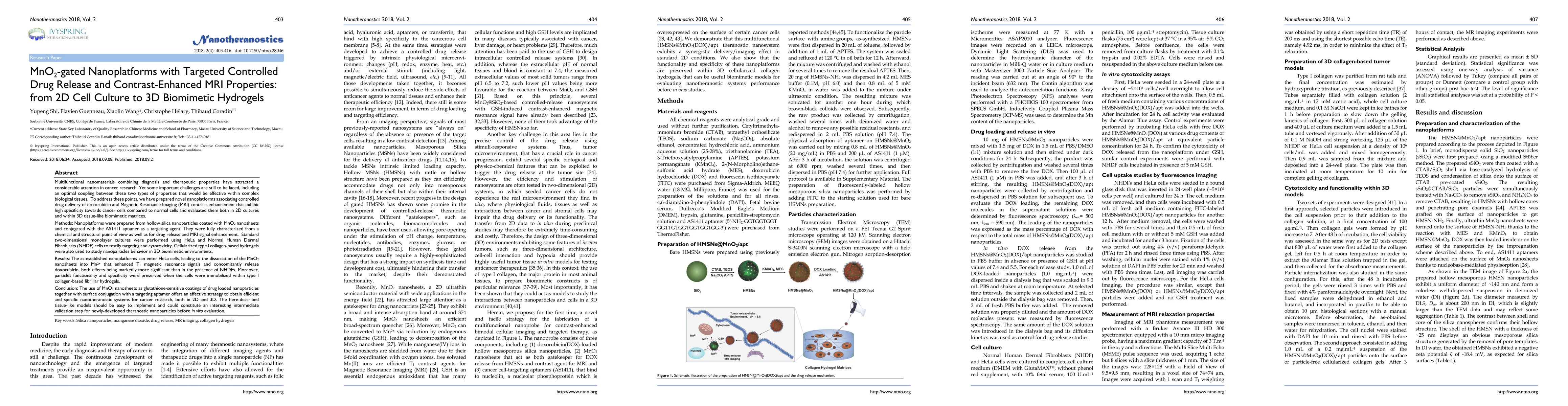 The research presents novel nanoplatforms combining controlled drug delivery of doxorubicin and MRI contrast enhancement, specifically targeting cancer cells. These nanoplatforms, prepared from hollow silica nanoparticles coated with MnO2 nanosheets and an aptamer, demonstrated effectiveness in both 2D cell cultures and 3D biomimetic hydrogels, offering a promising strategy for cancer research and therapy.