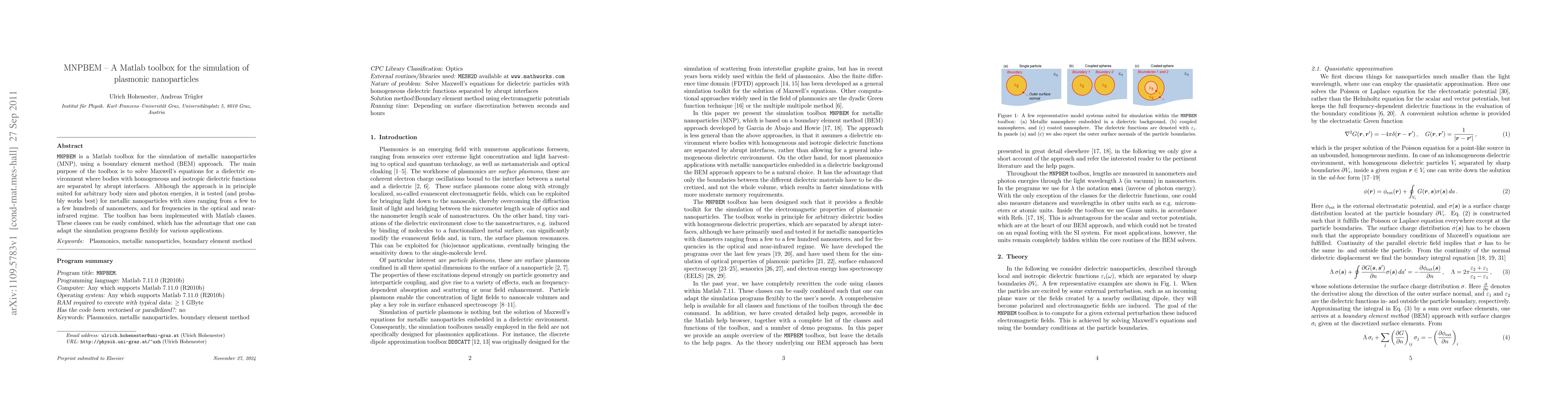 MNPBEM is a Matlab toolbox for simulating metallic nanoparticles using a boundary element method to solve Maxwell's equations in dielectric environments. It is particularly effective for nanoparticles in the optical and near-infrared frequency range.