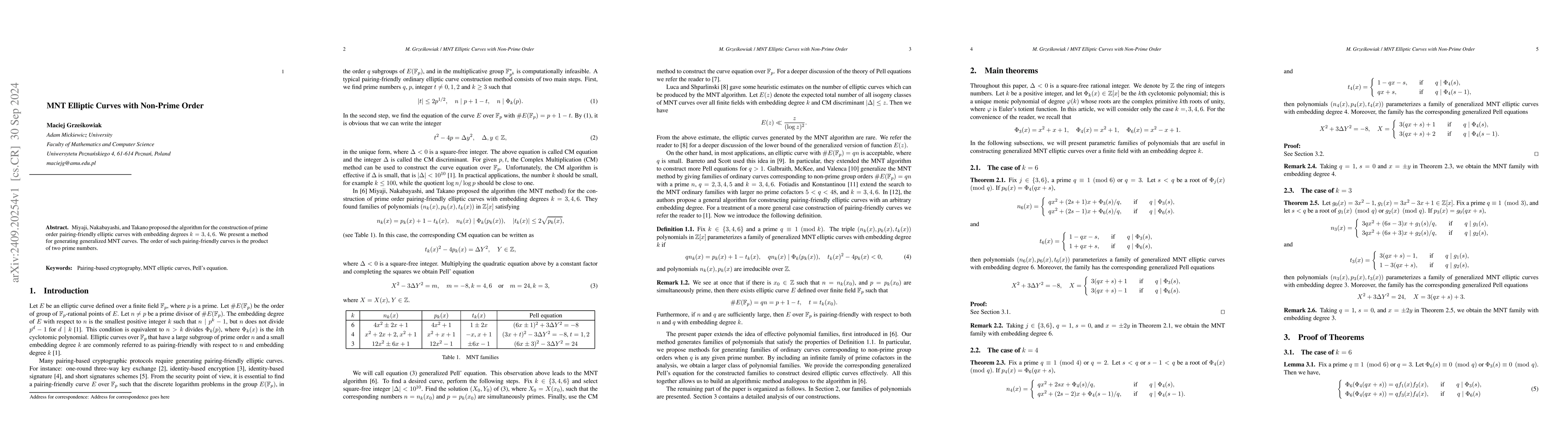 This paper presents a method to construct generalized MNT elliptic curves with non-prime order that is a product of two prime numbers, extending the original Miyaji, Nakabayashi, and Takano algorithm for prime order curves with embedding degrees $k=3,4,6$.
