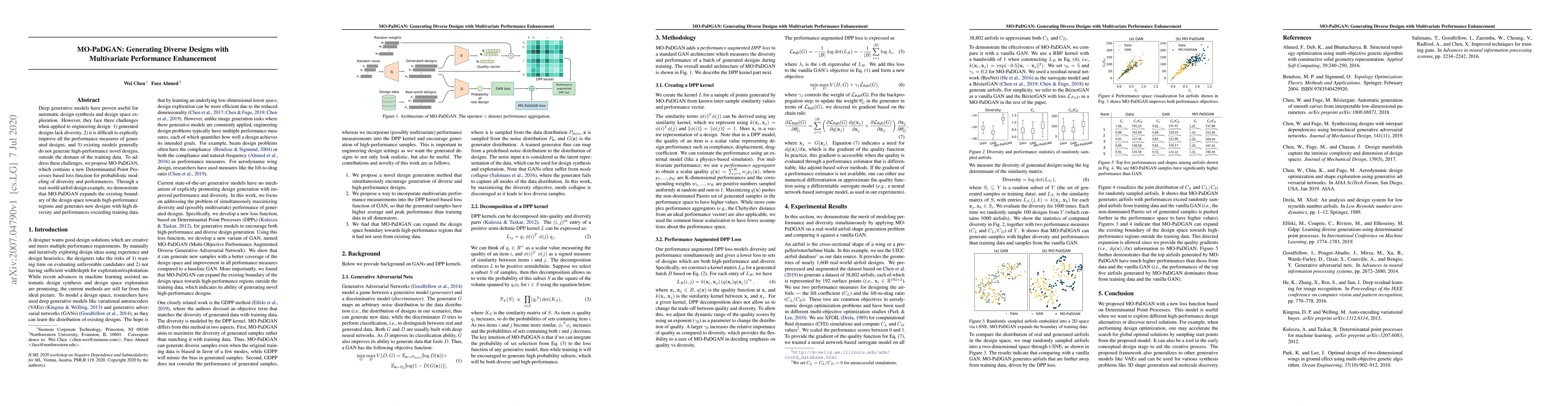MO-PaDGAN addresses the challenges of diversity, performance improvement, and novelty in deep generative design models by incorporating a Determinantal Point Processes based loss function. It successfully generates diverse, high-performance designs beyond the training data, as demonstrated in an airfoil design example.