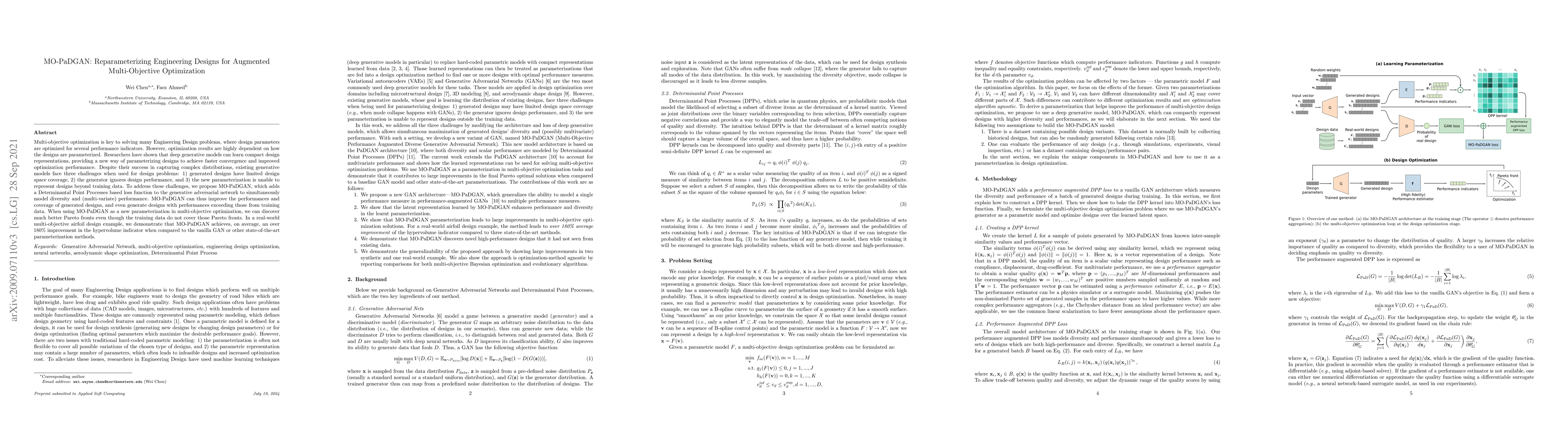 MO-PaDGAN introduces a novel parameterization method using a generative adversarial network enhanced with a Determinantal Point Processes loss function to improve multi-objective optimization in engineering design. It addresses challenges of limited design space coverage, performance ignorance, and lack of generalization, achieving superior Pareto front discovery and performance improvements.