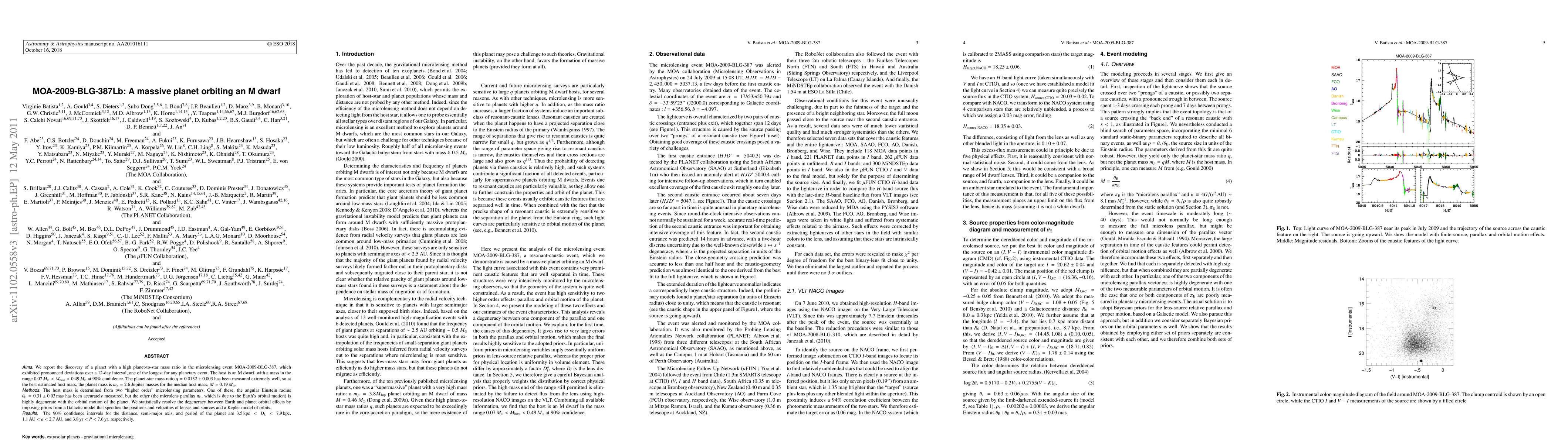 The paper reports the discovery of a massive planet, MOA-2009-BLG-387Lb, with a high planet-to-star mass ratio orbiting an M dwarf, characterized by a well-measured mass ratio of q = 0.0132. The planet is estimated to be around 2.6 Jupiter masses, with a semi-major axis of 1.1 to 2.7 AU and an orbital period of 3.8 to 7.6 years.