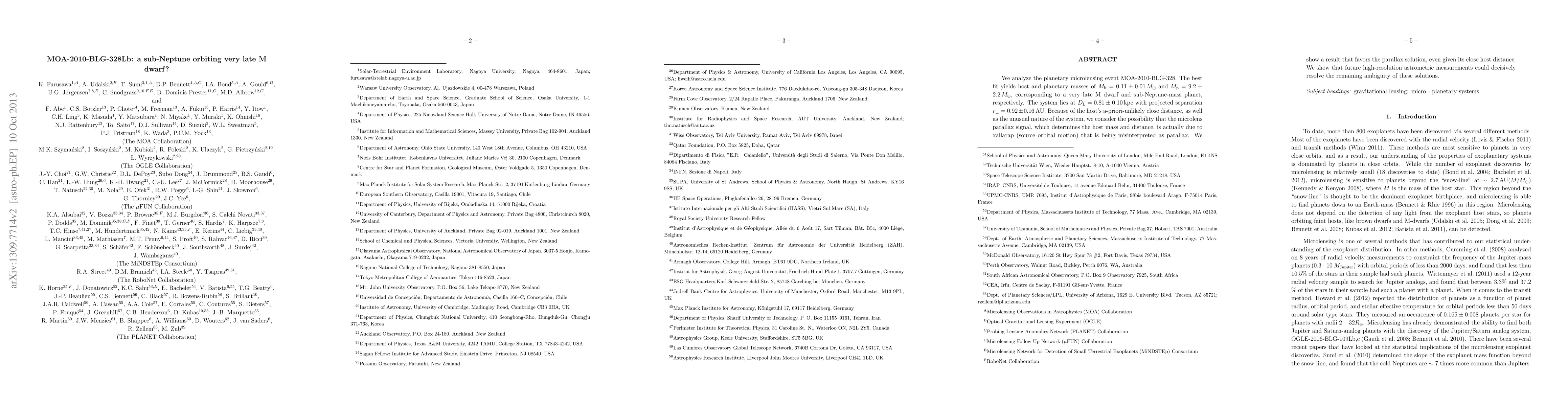 The paper analyzes the microlensing event MOA-2010-BLG-328, revealing a sub-Neptune-mass planet orbiting a very late M dwarf with a best-fit mass ratio of 9.2 M_Earth to 0.11 M_sun. Despite the host's unusual proximity, the study favors the parallax solution and suggests future astrometric measurements could resolve remaining ambiguities.
