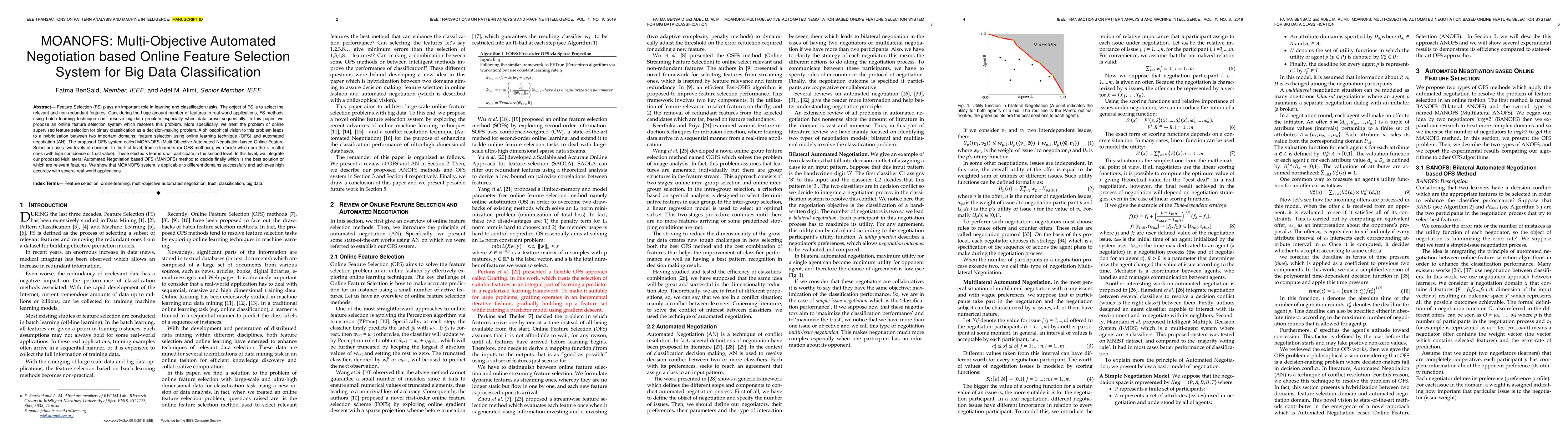 The paper introduces MOANOFS, an online feature selection system for big data classification that combines online learning techniques and automated negotiation to select relevant features sequentially. The system employs a two-level decision-making process to identify the most trustworthy learners and then uses a multilateral automated negotiation method to determine the optimal feature set, demonstrating high accuracy across various real-world applications.