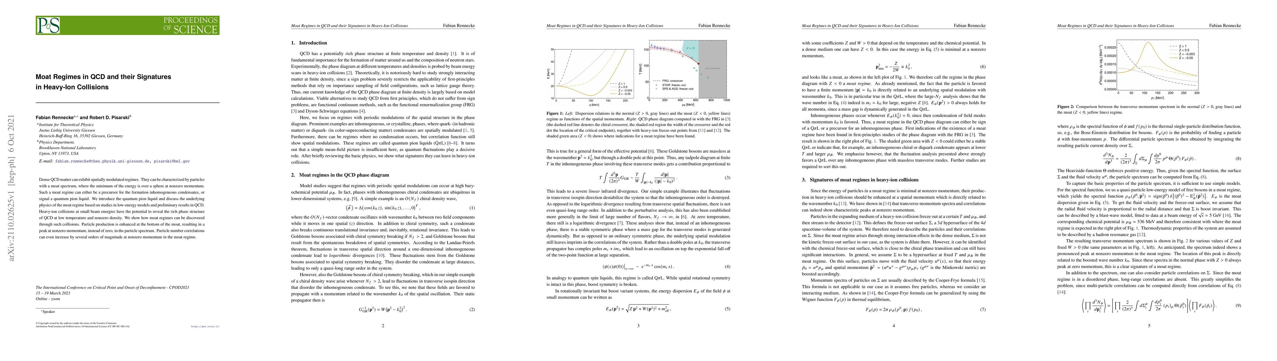 Dense QCD matter can exhibit spatially modulated regimes. They can be characterized by particles with a moat spectrum, where the minimum of the energy is over a sphere at nonzero momentum. Such a moat regime can either be a precursor for the formation inhomogeneous condensates, or signal a quantum pion liquid. We introduce the quantum pion liquid and discuss the underlying physics of the moat regime based on studies in low-energy models and preliminary results in QCD. Heavy-ion collisions at small beam energies have the potential to reveal the rich phase structure of QCD at low temperature and nonzero density. We show how moat regimes can be discovered through such collisions. Particle production is enhanced at the bottom of the moat, resulting in a peak at nonzero momentum, instead of zero, in the particle spectrum. Particle number correlations can even increase by several orders of magnitude at nonzero momentum in the moat regime.