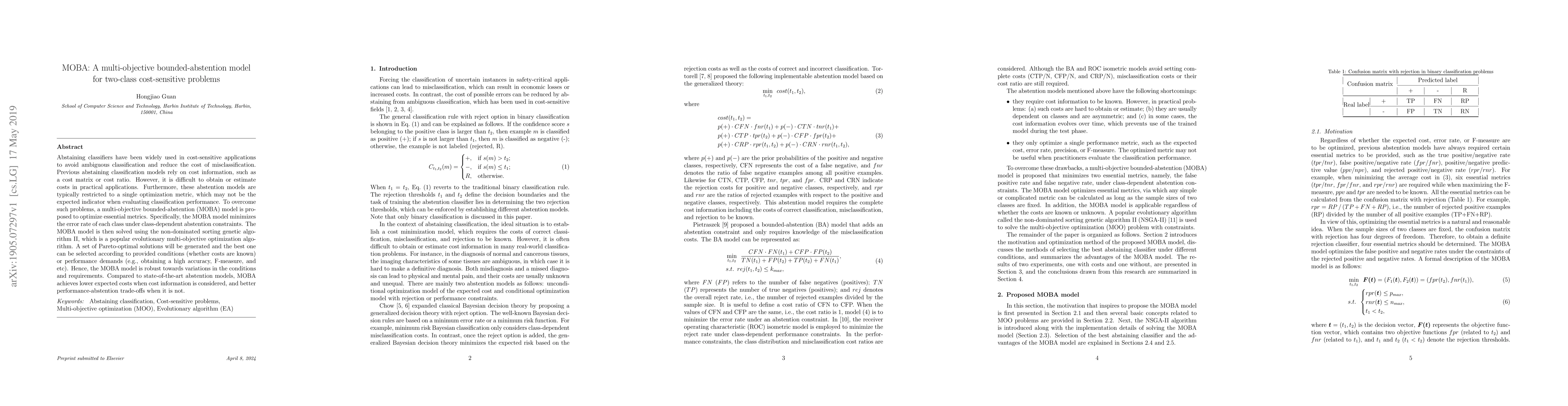 The MOBA model proposes a multi-objective approach to bounded-abstention classification, optimizing essential metrics without relying on cost information. It achieves better performance-abstention trade-offs and lower expected costs when cost data is available, compared to existing single-objective models.
