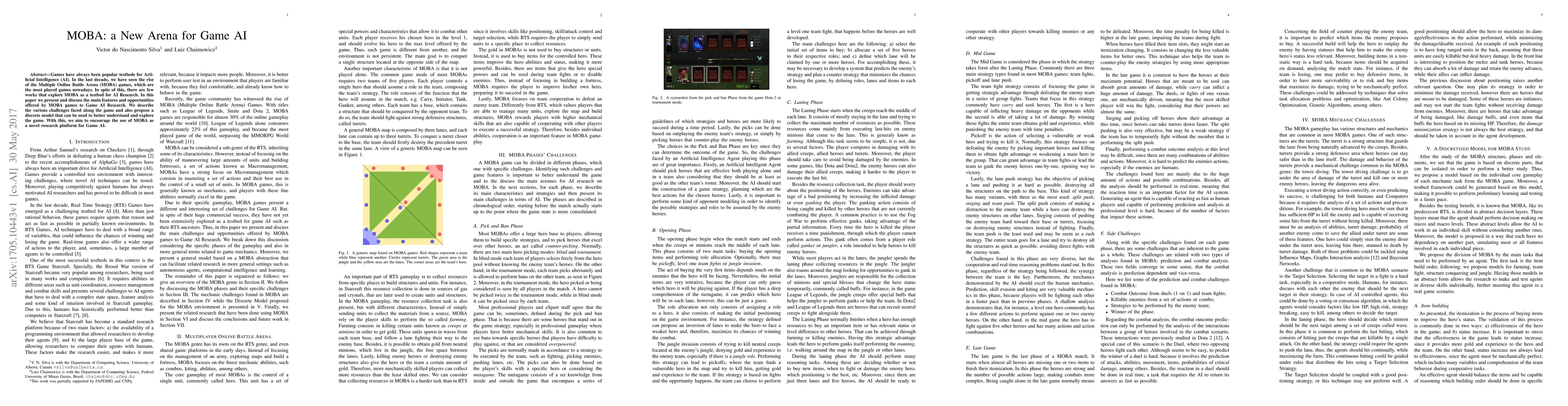 This paper explores the potential of Multiple Online Battle Arena (MOBA) games as a new testing ground for Game AI research, detailing the unique challenges and opportunities they present, and proposing a discrete model to facilitate deeper study in this area. The aim is to encourage further exploration of MOBA games as a novel research platform for AI advancements.