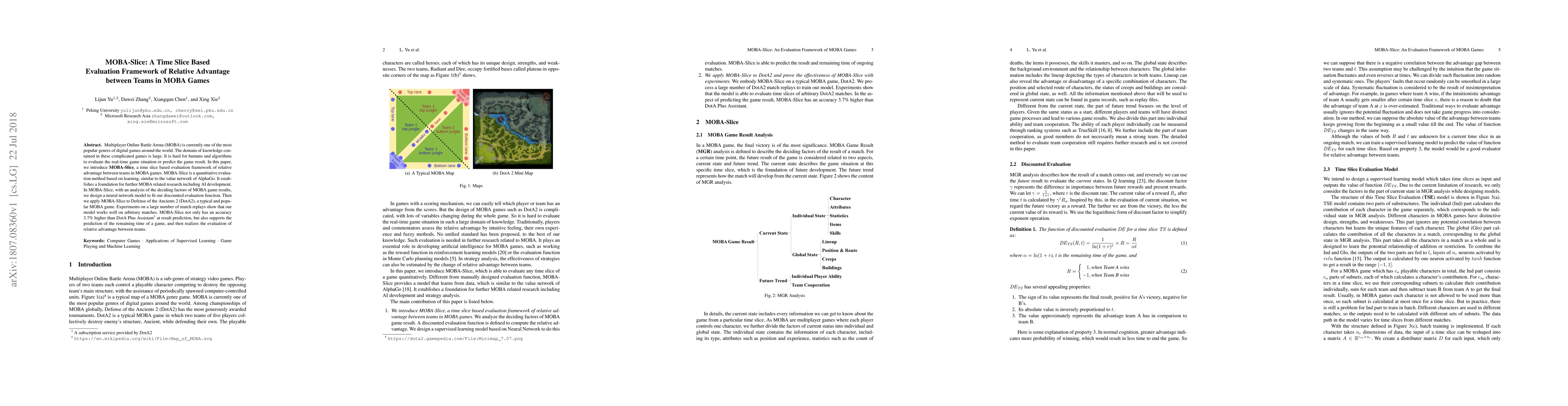 MOBA-Slice introduces a time slice evaluation framework to quantitatively assess the relative advantage between teams in MOBA games, achieving better prediction accuracy and game outcome estimation compared to existing tools. The framework uses a neural network model trained on match replays, particularly demonstrating effectiveness in Defense of the Ancients 2 (DotA2).