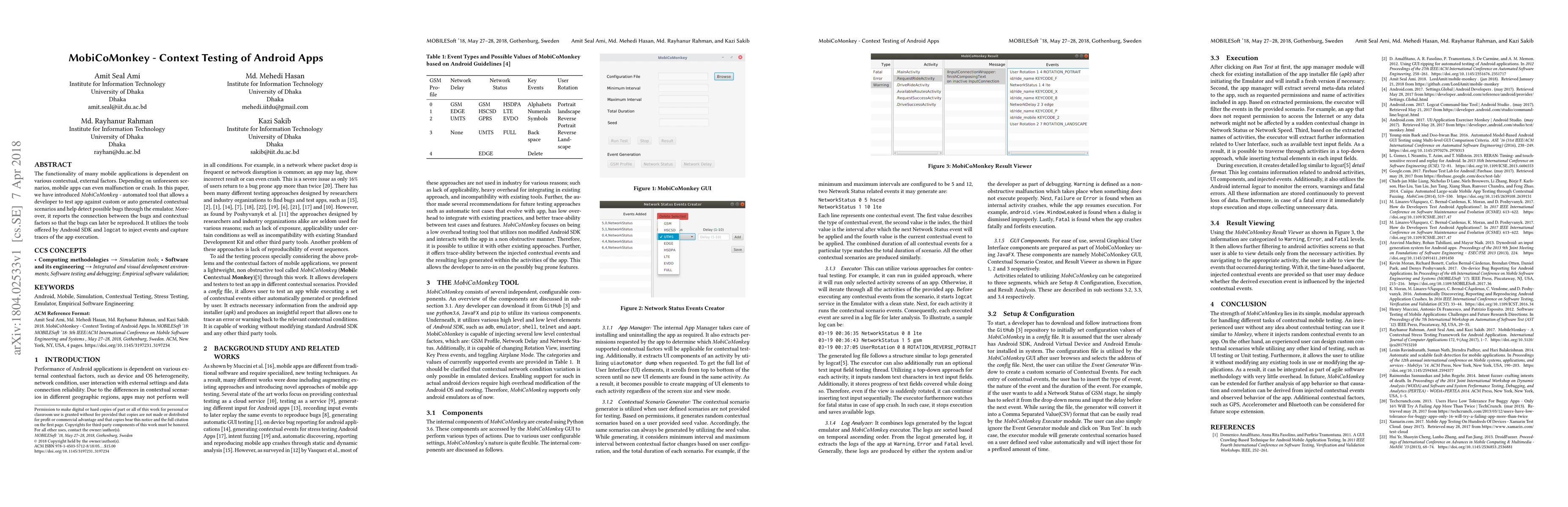 MobiCoMonkey is an automated tool for testing Android apps against custom or auto-generated contextual scenarios to detect potential bugs. It reports the relationship between detected bugs and contextual factors, utilizing Android SDK and logcat for event injection and execution tracing.