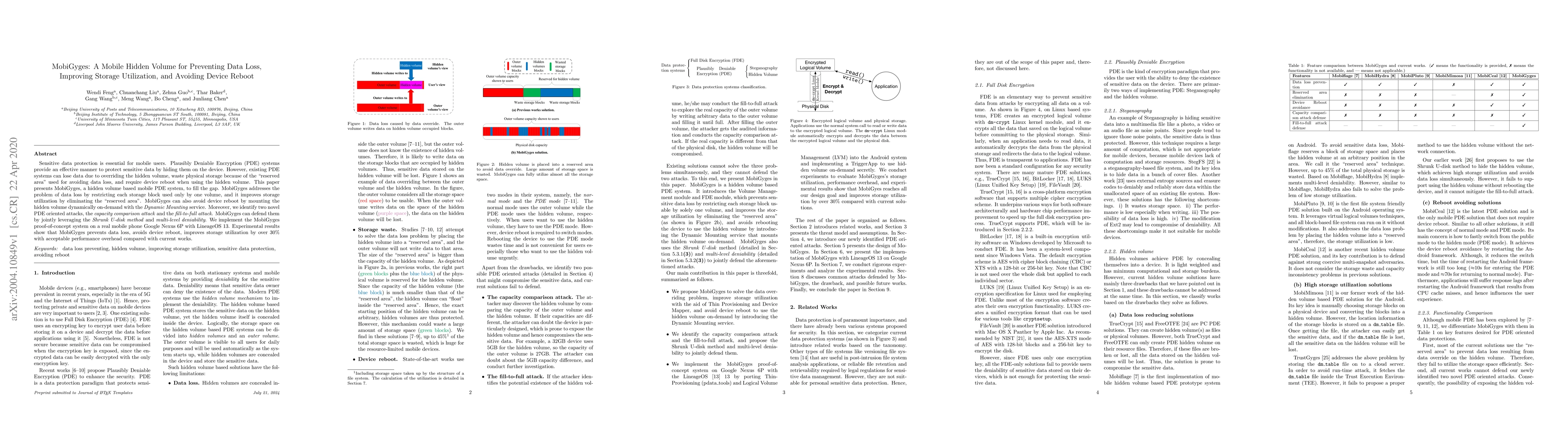 MobiGyges is a mobile Plausibly Deniable Encryption system designed to protect sensitive data without losing information, improving storage efficiency, and avoiding device reboots. It achieves this by dynamically mounting hidden volumes and eliminating reserved storage areas, while defending against novel attacks through multi-level deniability.