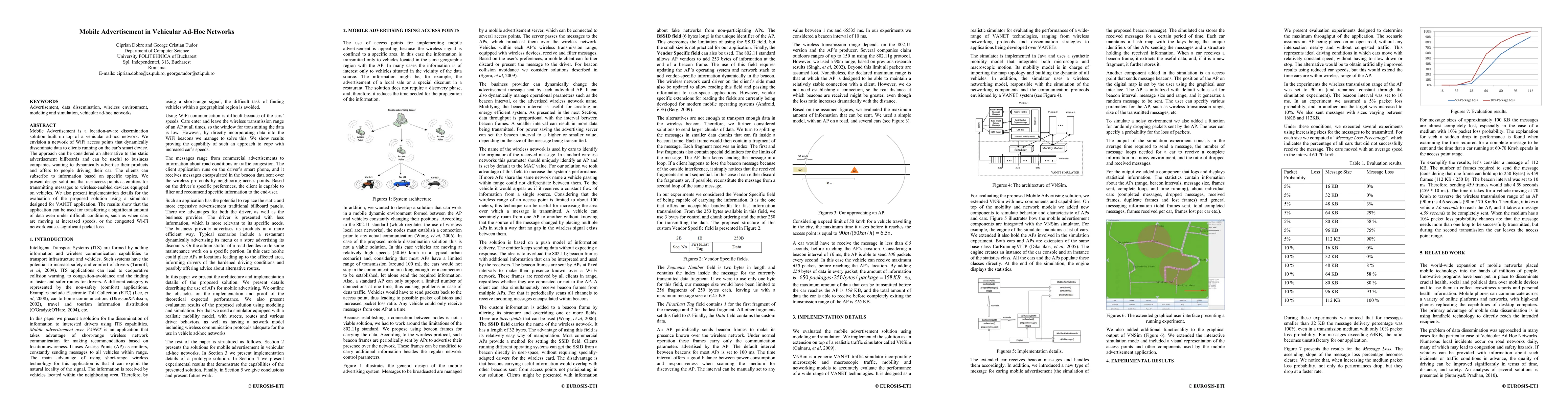 Mobile Advertisement is a location-aware dissemination solution built on top of a vehicular ad-hoc network. We envision a network of WiFi access points that dynamically disseminate data to clients running on the car's smart device. The approach can be considered an alternative to the static advertisement billboards and can be useful to business companies wanting to dynamically advertise their products and offers to people driving their car. The clients can subscribe to information based on specific topics. We present design solutions that use access points as emitters for transmitting messages to wireless-enabled devices equipped on vehicles. We also present implementation details for the evaluation of the proposed solution using a simulator designed for VANET application. The results show that the application can be used for transferring a significant amount of data even under difficult conditions, such as when cars are moving at increased speeds, or the congested Wi-Fi network causes significant packet loss.