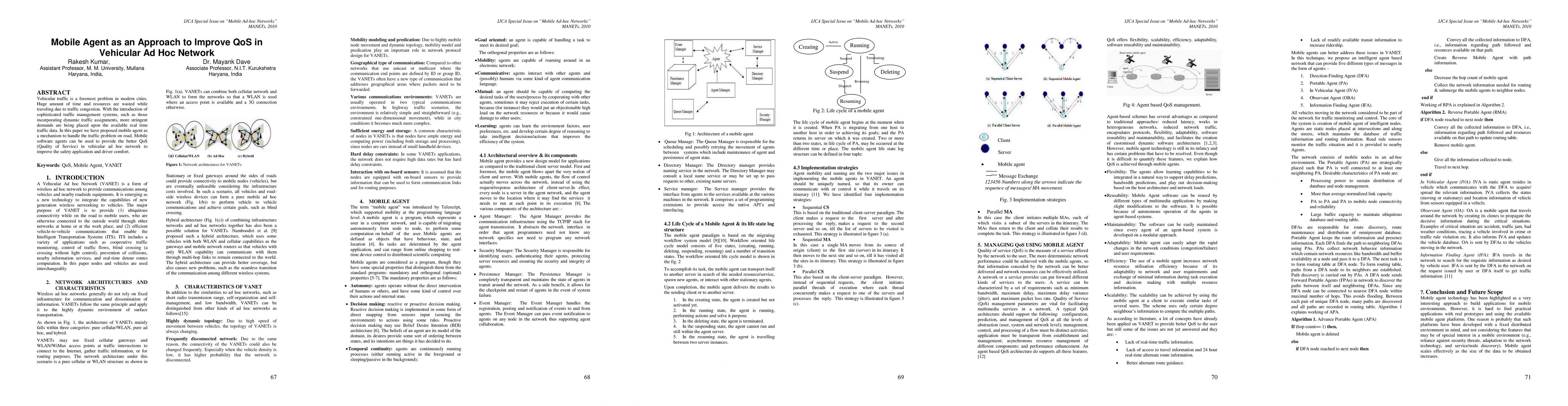 Vehicular traffic is a foremost problem in modern cities. Huge amount of time and resources are wasted while traveling due to traffic congestion. With the introduction of sophisticated traffic management systems, such as those incorporating dynamic traffic assignments, more stringent demands are being placed upon the available real time traffic data. In this paper we have proposed mobile agent as a mechanism to handle the traffic problem on road. Mobile software agents can be used to provide the better QoS (Quality of Service) in vehicular ad hoc network to improve the safety application and driver comfort.