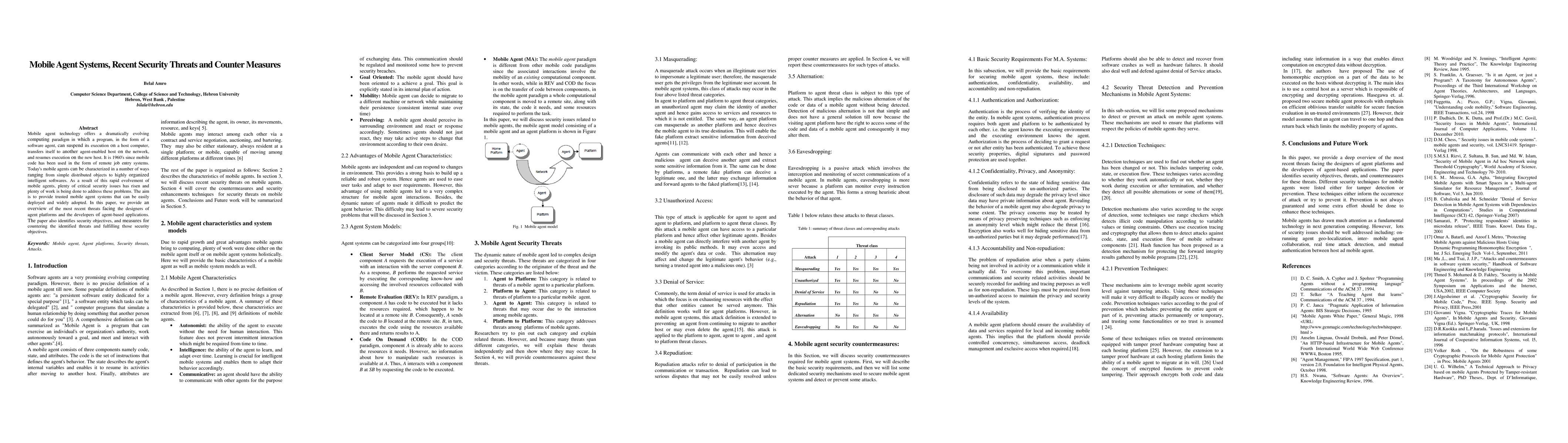 This paper reviews recent security threats in mobile agent systems and outlines countermeasures to address these issues. It emphasizes the evolving nature of mobile agents and discusses security objectives and measures to ensure trusted, deployable, and widely adopted mobile agent platforms.