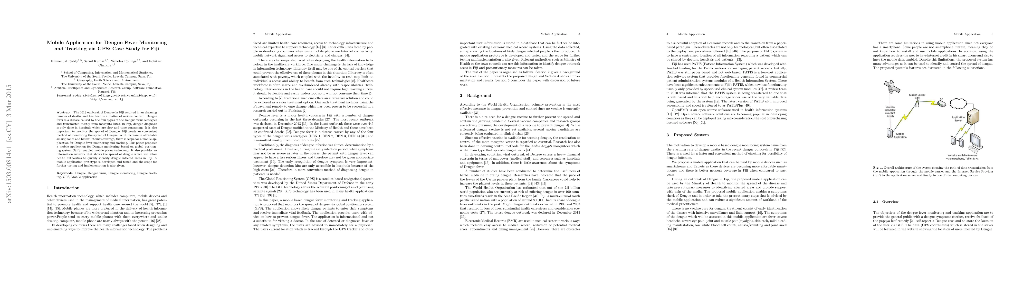 This paper proposes a GPS-enabled mobile application to monitor and track Dengue fever in Fiji, addressing the limitations of slow hospital-based diagnosis and the need for real-time tracking to quickly identify infected areas. A prototype was developed and tested, highlighting potential for broader implementation.