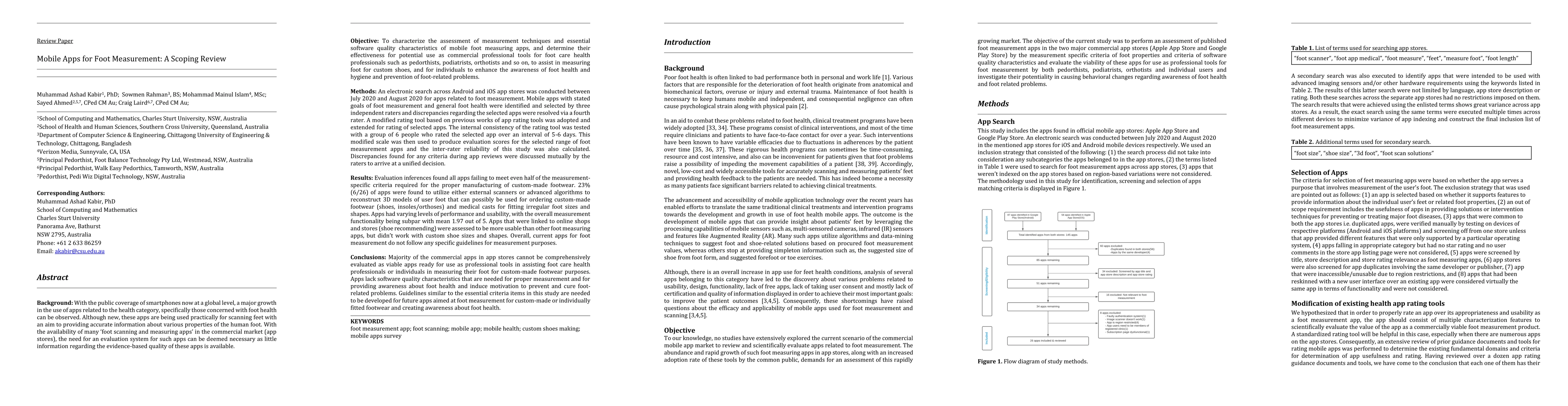 With the proliferation of smart phone, a major growth in the use of apps related to the health category, specifically those concerned with foot health can be observed. Although new, these apps are being used practically for scanning feet with an aim to providing accurate information about various properties of the human foot. With the availability of many 'foot scanning and measuring apps' in the app stores, the need for an evaluation system for such apps can be deemed necessary as little information regarding the evidence-based quality of these apps is available. To characterize the assessment of measurement techniques and essential software quality characteristics of mobile foot measuring apps, and determine their effectiveness for potential use as commercial professional tools for foot care health professionals such as pedorthists, podiatrists, orthotists and so on, to assist in measuring foot for custom shoes, and for individuals to enhance the awareness of foot health and hygiene and prevention of foot-related problems. An electronic search across Android and iOS app stores was conducted between July 2020 and August 2020 for apps related to foot measurement. Mobile apps with stated goals of foot measurement and general foot health were identified and selected by three independent raters and discrepancies regarding the selected apps were resolved via a fourth rater. Evaluation inferences found all apps failing to meet even half of the measurement-specific criteria required for the proper manufacturing of custom-made footwear. 23% (6/26) of apps were found to utilize either external scanners or advanced algorithms to reconstruct 3D models of user foot that can possibly be used for ordering custom-made footwear and medical casts for fitting irregular foot sizes and shapes. Overall, current apps for foot measurement do not follow any specific guidelines for measurement purposes.