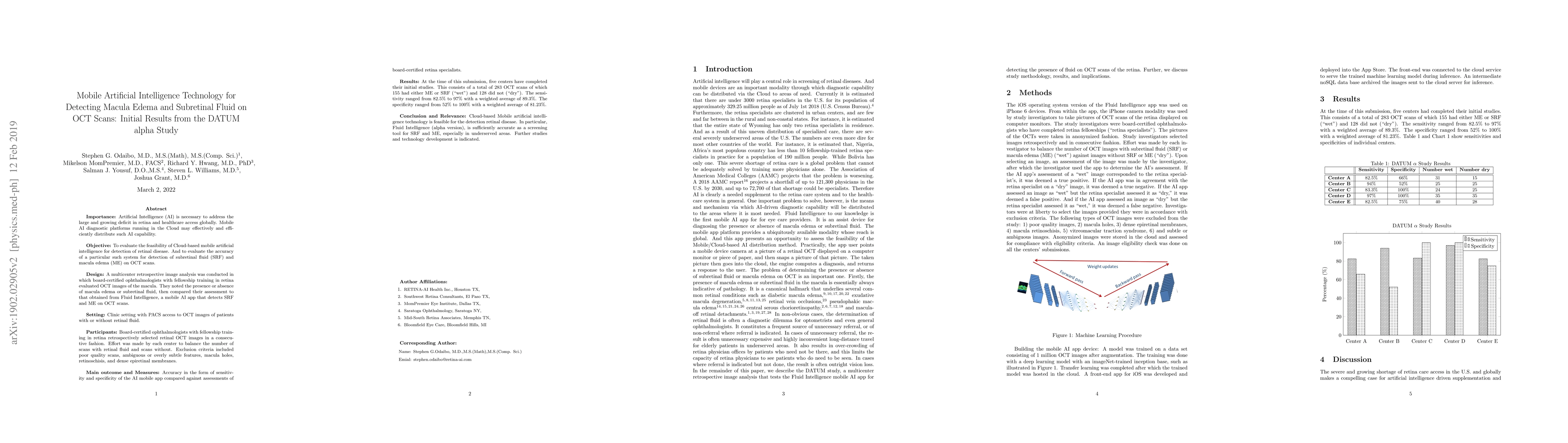 Artificial Intelligence (AI) is necessary to address the large and growing deficit in retina and healthcare access globally. And mobile AI diagnostic platforms running in the Cloud may effectively and efficiently distribute such AI capability. Here we sought to evaluate the feasibility of Cloud-based mobile artificial intelligence for detection of retinal disease. And to evaluate the accuracy of a particular such system for detection of subretinal fluid (SRF) and macula edema (ME) on OCT scans. A multicenter retrospective image analysis was conducted in which board-certified ophthalmologists with fellowship training in retina evaluated OCT images of the macula. They noted the presence or absence of ME or SRF, then compared their assessment to that obtained from Fluid Intelligence, a mobile AI app that detects SRF and ME on OCT scans. Investigators consecutively selected retinal OCTs, while making effort to balance the number of scans with retinal fluid and scans without. Exclusion criteria included poor scan quality, ambiguous features, macula holes, retinoschisis, and dense epiretinal membranes. Accuracy in the form of sensitivity and specificity of the AI mobile App was determined by comparing its assessments to those of the retina specialists. At the time of this submission, five centers have completed their initial studies. This consists of a total of 283 OCT scans of which 155 had either ME or SRF ("wet") and 128 did not ("dry"). The sensitivity ranged from 82.5% to 97% with a weighted average of 89.3%. The specificity ranged from 52% to 100% with a weighted average of 81.23%. CONCLUSION: Cloud-based Mobile AI technology is feasible for the detection retinal disease. In particular, Fluid Intelligence (alpha version), is sufficiently accurate as a screening tool for SRF and ME, especially in underserved areas. Further studies and technology development is needed.